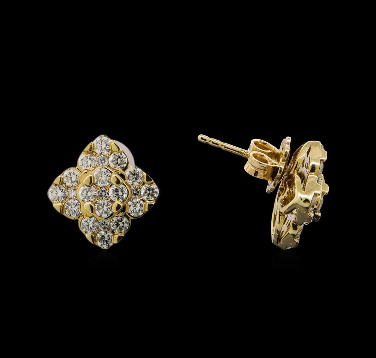 One pair electronically tested 14KT yellow gold ladies cast diamond stud earrings with friction posts with a bright polish finish. Identified with markings of "585". Condition is new. Containing: Thirty-Four prong set round brilliant cut diamonds, measuring 2.10 - 1.30 x 1.02mm (depth est.) approximate total weight of 34 Stones = 0.70 ct. Clarity: SI-1 to I-1. Color: I - J, Cut is Good. Diamonds are graded in the mounting, unless otherwise stated. Total Weight of Diamonds 0.70 ct. Total Weight of Earrings 5.70 grams. GGL Appraised.