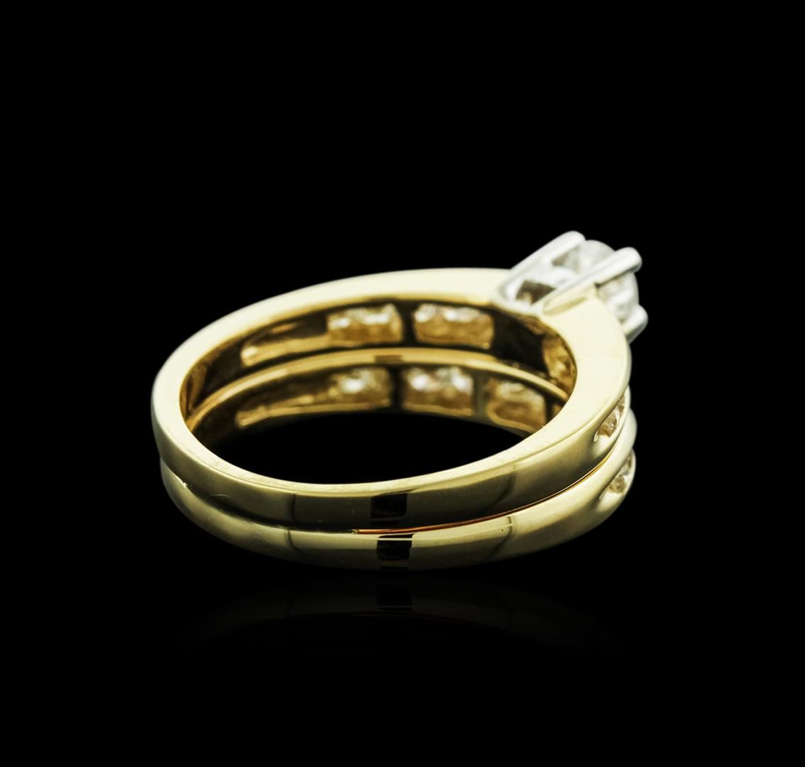 One wedding ring set featuring: 14KT yellow gold weighing 5.70 grams containing one center diamond with a total weight of 0.25ct and diamonds with a total weight of 0.45ct.