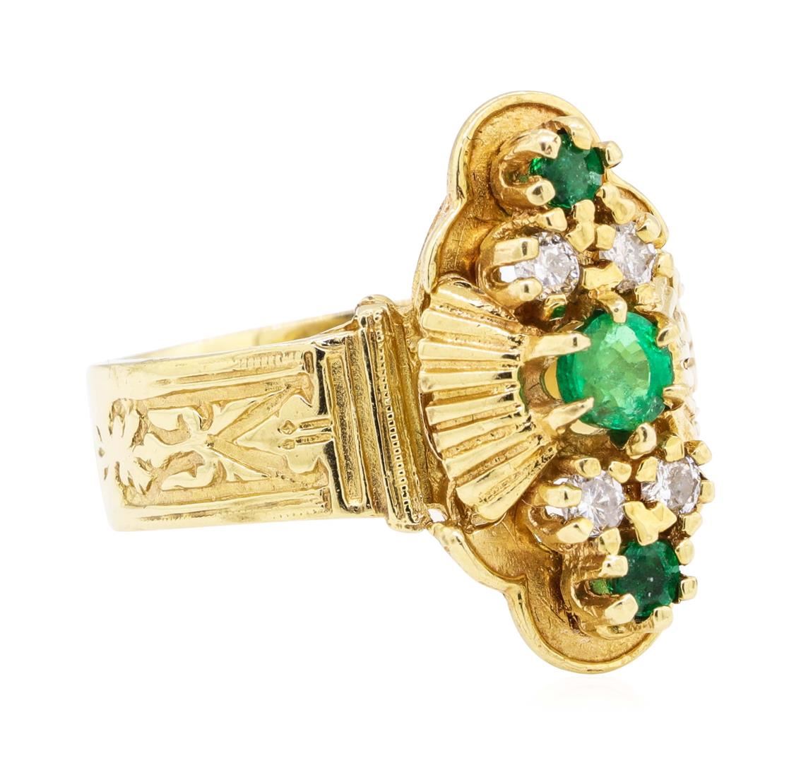 One ladies ring featuring: 14KT yellow gold weighing 10.0 grams containing emeralds weighing 0.50ctw and diamonds weighing 0.20ctw. The ring is a size 8.5.