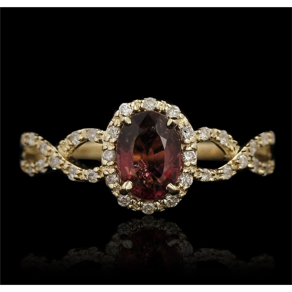 One electronically tested 14KT yellow gold ladies cast tourmaline and diamond ring with a bright polish finish. Condition is new, good workmanship. The featured tourmaline is set within a diamond bezel supported by intertwining diamond set shoulders, completed by a one and one-half millimeter wide band. Trademark is ORIANNE. Identified with markings of "14K". Containing: One prong set oval mixed cut natural rubellite, measuring 6.90 x 5.00 x 3.00mm, 8%. bulge factor, approximate weight of 0.70ct., clarity is slightly included, type III, medium dark, very slightly brownish, strongly purplish red color, (GIA stpR 6/3), cut is good. Transmitting light with a minimum of distortion, transparent. Naturally occurring internal & external characteristics are present. Graded in the setting. Thirty-Two prong set round brilliant cut diamonds, measuring 1.10 - 1.00 x 0.63mm (depth est.) approximate. Total Weight of 32 Stones = 0.17ct. Graded in the setting. Clarity: I-1 to I-2. Color: G - I. Total Weight of Colored Stones 0.70ct. Total Weight of Diamonds 0.17ct. Total Weight of Ring 2.36 grams. AIG Appraised at $1,465.00.