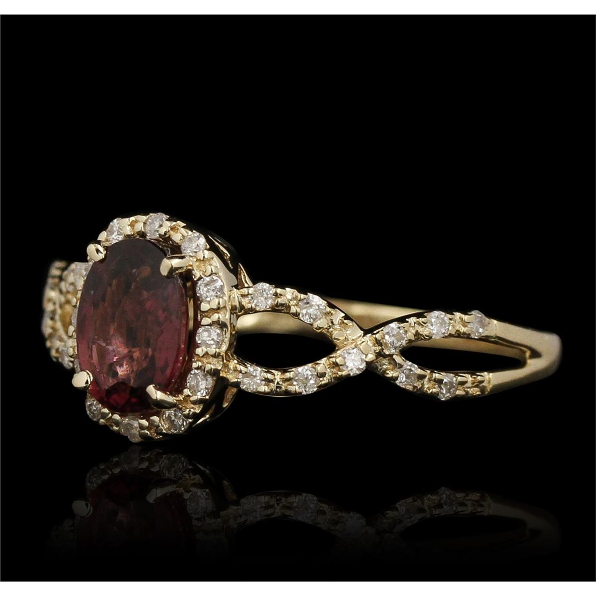 One electronically tested 14KT yellow gold ladies cast tourmaline and diamond ring with a bright polish finish. Condition is new, good workmanship. The featured tourmaline is set within a diamond bezel supported by intertwining diamond set shoulders, completed by a one and one-half millimeter wide band. Trademark is ORIANNE. Identified with markings of "14K". Containing: One prong set oval mixed cut natural rubellite, measuring 6.90 x 5.00 x 3.00mm, 8%. bulge factor, approximate weight of 0.70ct., clarity is slightly included, type III, medium dark, very slightly brownish, strongly purplish red color, (GIA stpR 6/3), cut is good. Transmitting light with a minimum of distortion, transparent. Naturally occurring internal & external characteristics are present. Graded in the setting. Thirty-Two prong set round brilliant cut diamonds, measuring 1.10 - 1.00 x 0.63mm (depth est.) approximate. Total Weight of 32 Stones = 0.17ct. Graded in the setting. Clarity: I-1 to I-2. Color: G - I. Total Weight of Colored Stones 0.70ct. Total Weight of Diamonds 0.17ct. Total Weight of Ring 2.36 grams. AIG Appraised at $1,465.00.
