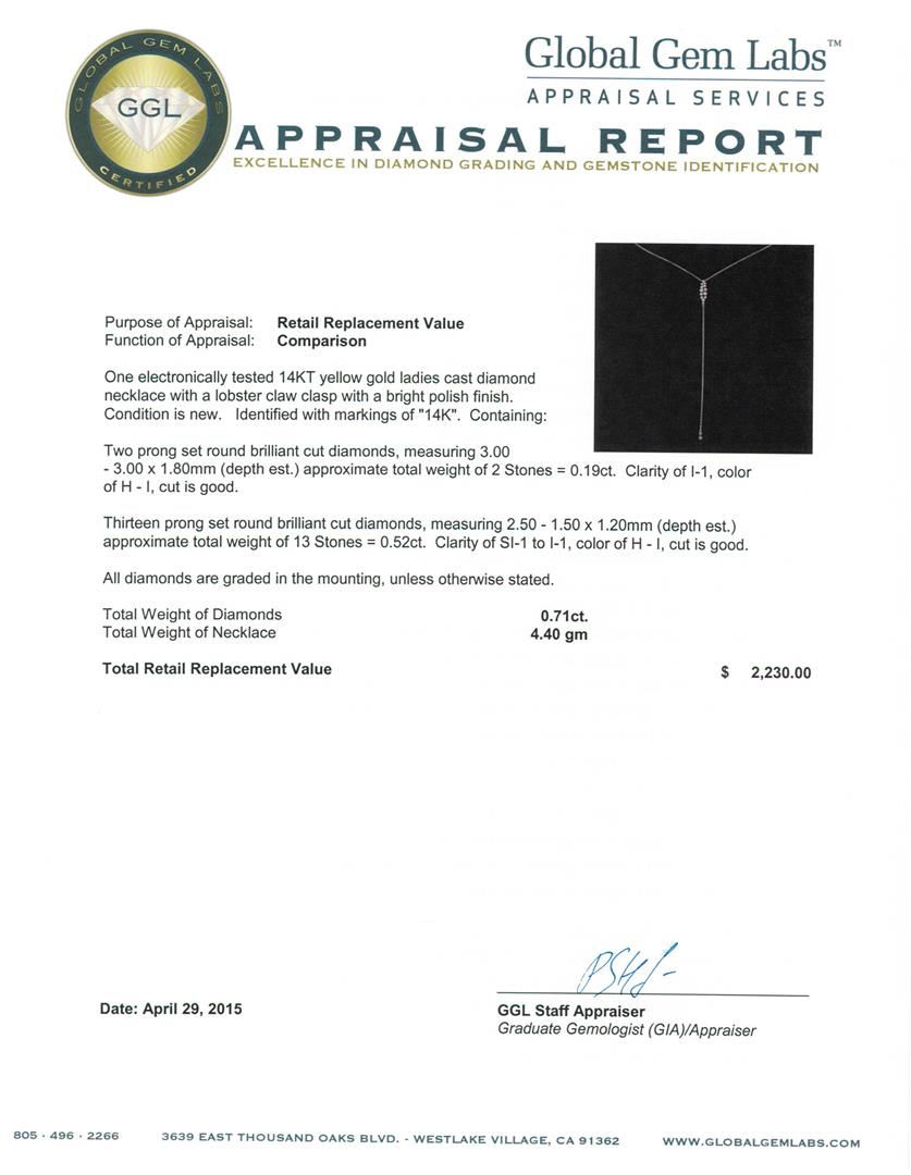 One electronically tested 14KT yellow gold ladies cast diamond necklace with a lobster claw clasp with a bright polish finish. Identified with markings of "14K". Condition is new. Containing: Two prong set round brilliant cut diamonds, measuring 3.00 - 3.00 x 1.80mm (depth est.) approximate total weight of 2 Stones = 0.19ct. Clarity: I-1. Color: H - I, Cut is Good. Thirteen prong set round brilliant cut diamonds, measuring 2.50 - 1.50 x 1.20mm (depth est.) approximate total weight of 13 Stones = 0.52ct. Clarity: SI-1 to I-1. Color: H - I, Cut is Good. All diamonds are graded in the mounting, unless otherwise stated. Total Weight of Diamonds 0.71ct. Total Weight of Necklace 4.40 grams. GGL Appraised at $2,230.00.