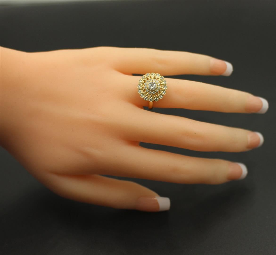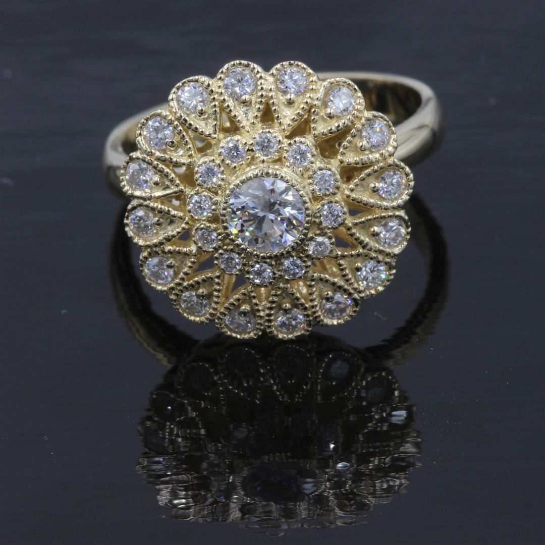 One 14K Yellow Gold Ladies Elegant Fashion Diamond Ring. Total carat weight is 0.73 Ct. Size 6.50 but resizable. Total gram weight 5.44 g. Condition is brand new. Center diamond weight 0.30 carats, shape brilliant round cut. Side diamonds total carats 0.43 ct. Color is G-H, clarity SI1- SI2, shape brilliant round cut, cut excellent.