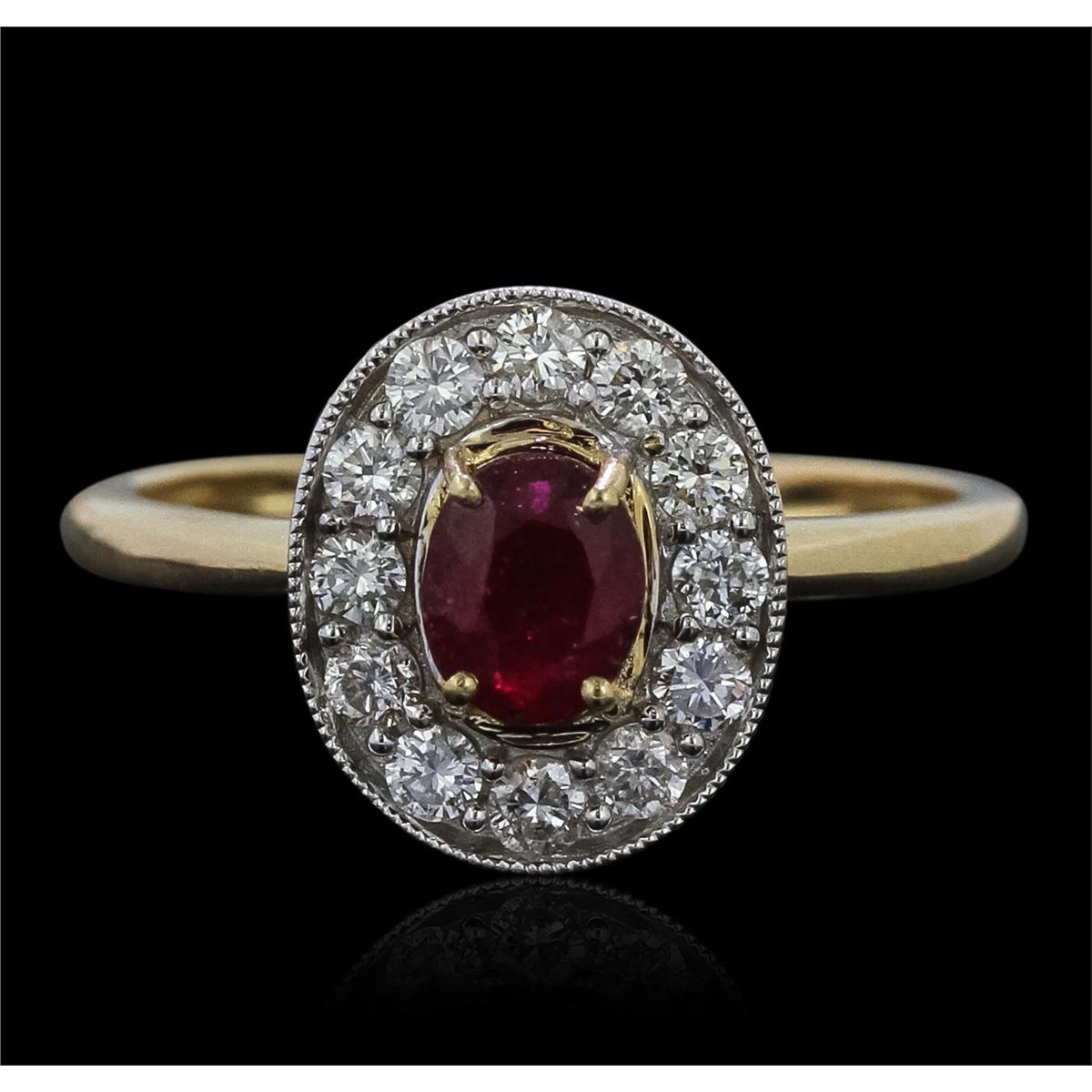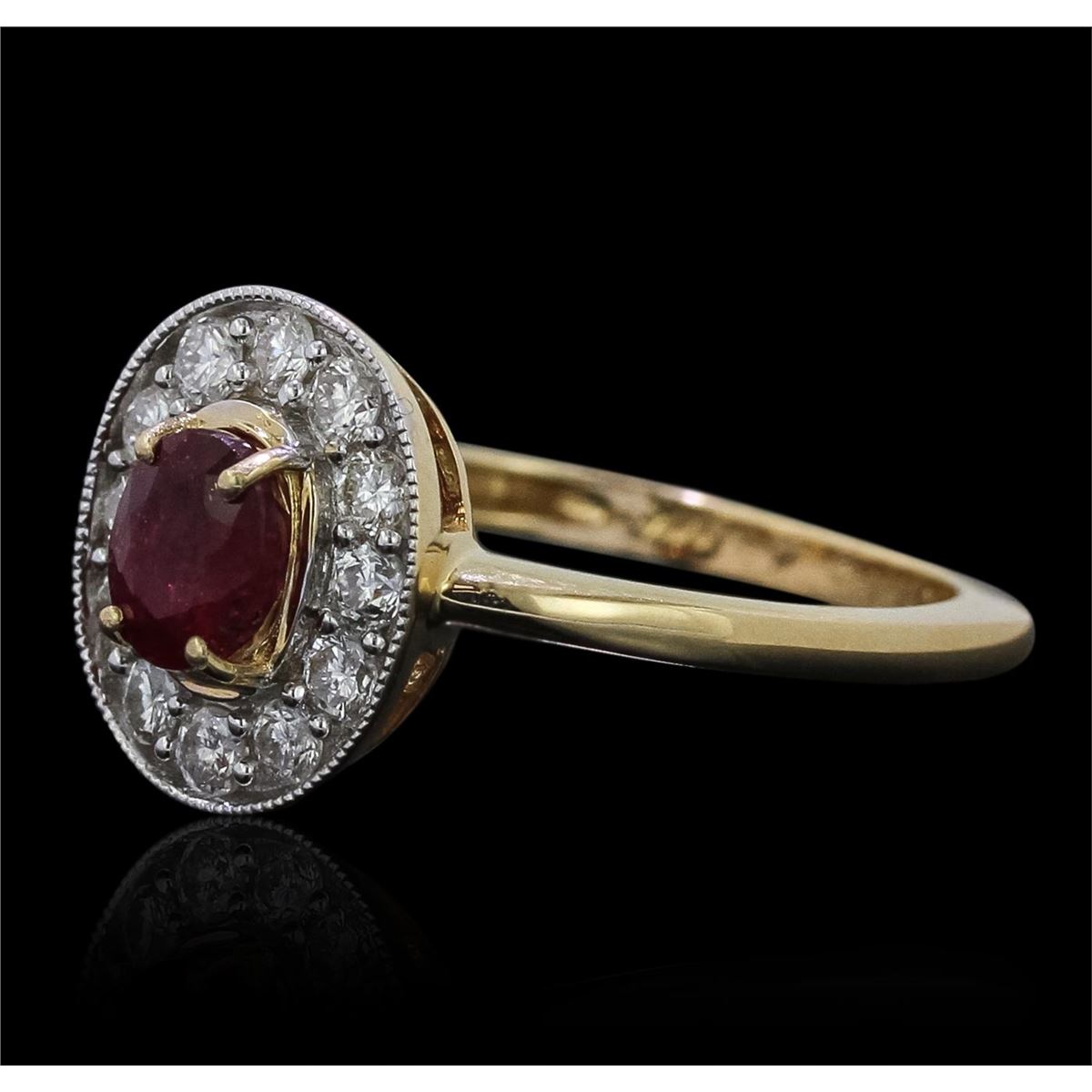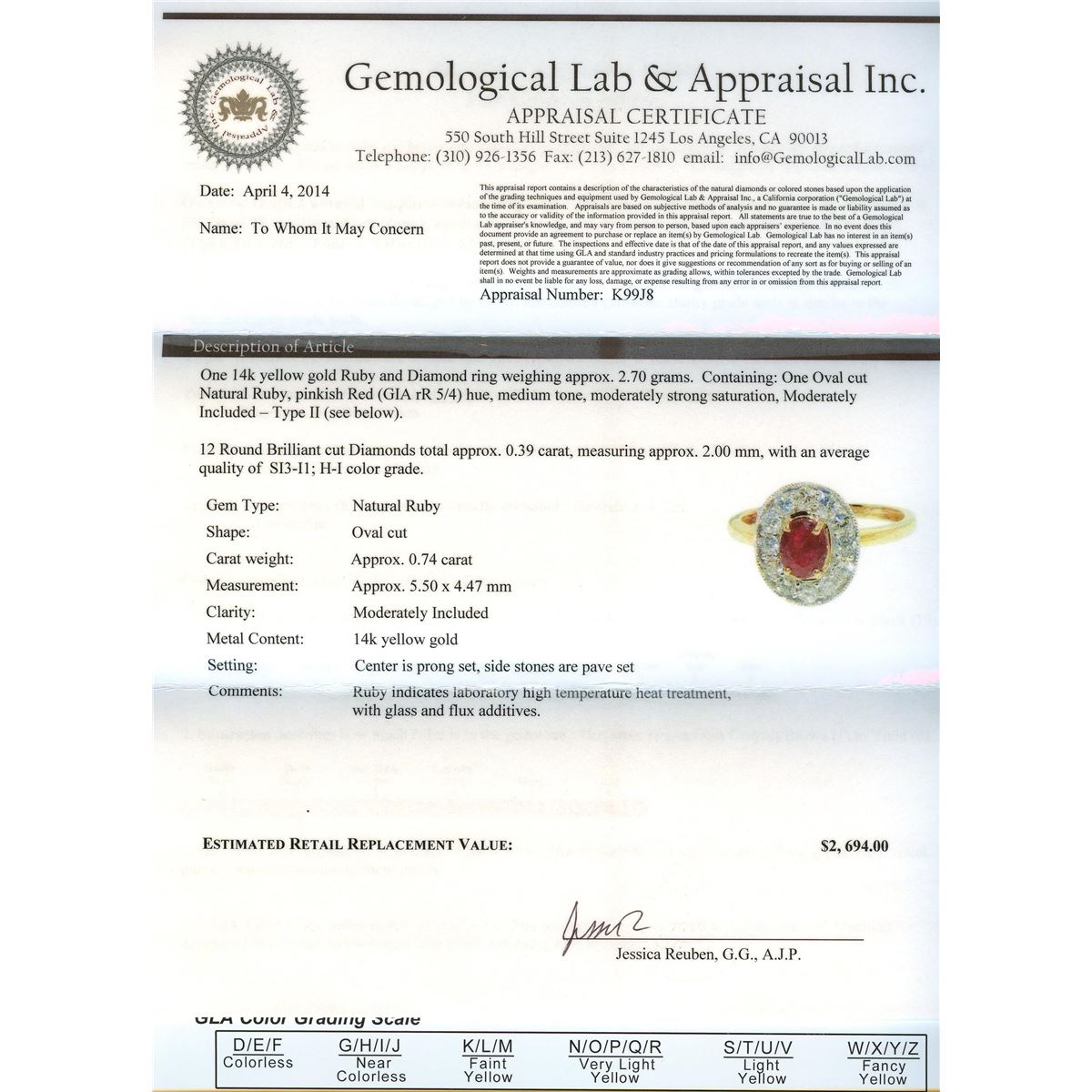 One 14KT yellow gold ruby and diamond ring weighing approx. 2.70 grams. Containing: one oval cut natural ruby, pinkish red (GIA rR 5/4) hue, medium tone, moderately strong saturation, moderately included - type II (see below). 12 round brilliant cut diamonds total approx. 0.39 carat, measuring approx. 2.00 mm, with an average quality of SI3-I1; H-1 color grade. Gem type: natural ruby. Shape: oval cut. Carat weight: approx. 0.74 carat. Measurement: approx. 5.50 x 4.47 mm. Clarity: moderately included. Metal content: 14KT yellow gold. Setting: center is prong set, side stones are pave set. Comments: ruby indicates laboratory high temperature heat treatment, with glass and flux additives. GLA Appraised at $2,694.00.