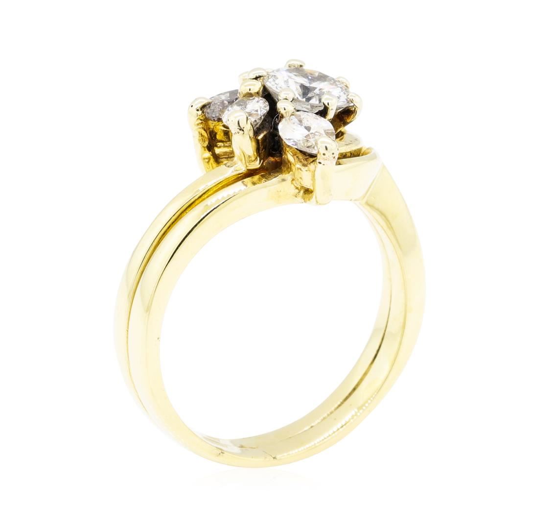 One set electronically tested 14KT yellow gold lady's combination cast & assembled wedding ring soldered to wedding band with a bright polish finish. The featured lady's ring has a double shank measuring 3.15 millimeters wide. Identified with markings of '14K'. Condition is new, good workmanship. Containing: One prong set round brilliant cut diamond, measuring 4.95 - 4.89 x 3.08mm (depth est.) approximate weight of 0.46ct. Graded in the setting. Color H Clarity SI-1 Cut Good Four prong set marquise shaped cut diamonds, measuring 4.00 x 2.20 x 1.38mm (depth est.) approximate total weight of 4 Stones = 0.29ct. Graded in the setting. Color H - J Clarity VS-2 to SI-2 Cut Good. Total Weight of Diamonds 0.75ct.. Total Weight of Ring Soldered To Wedding Band 4.00gm. GAS Appraised.