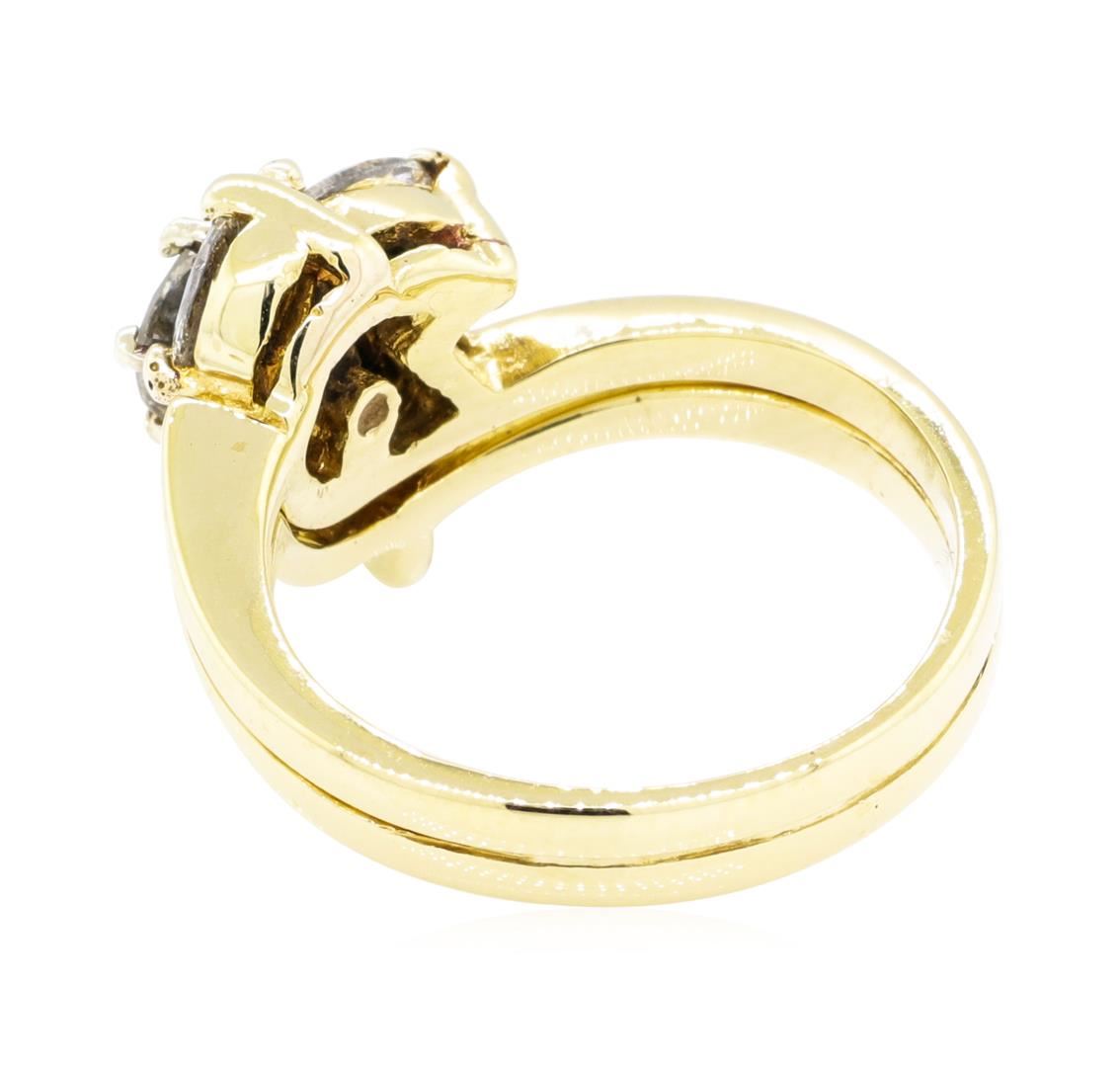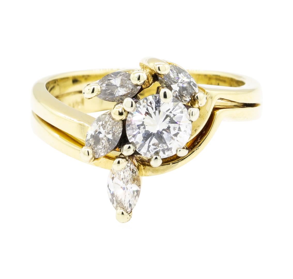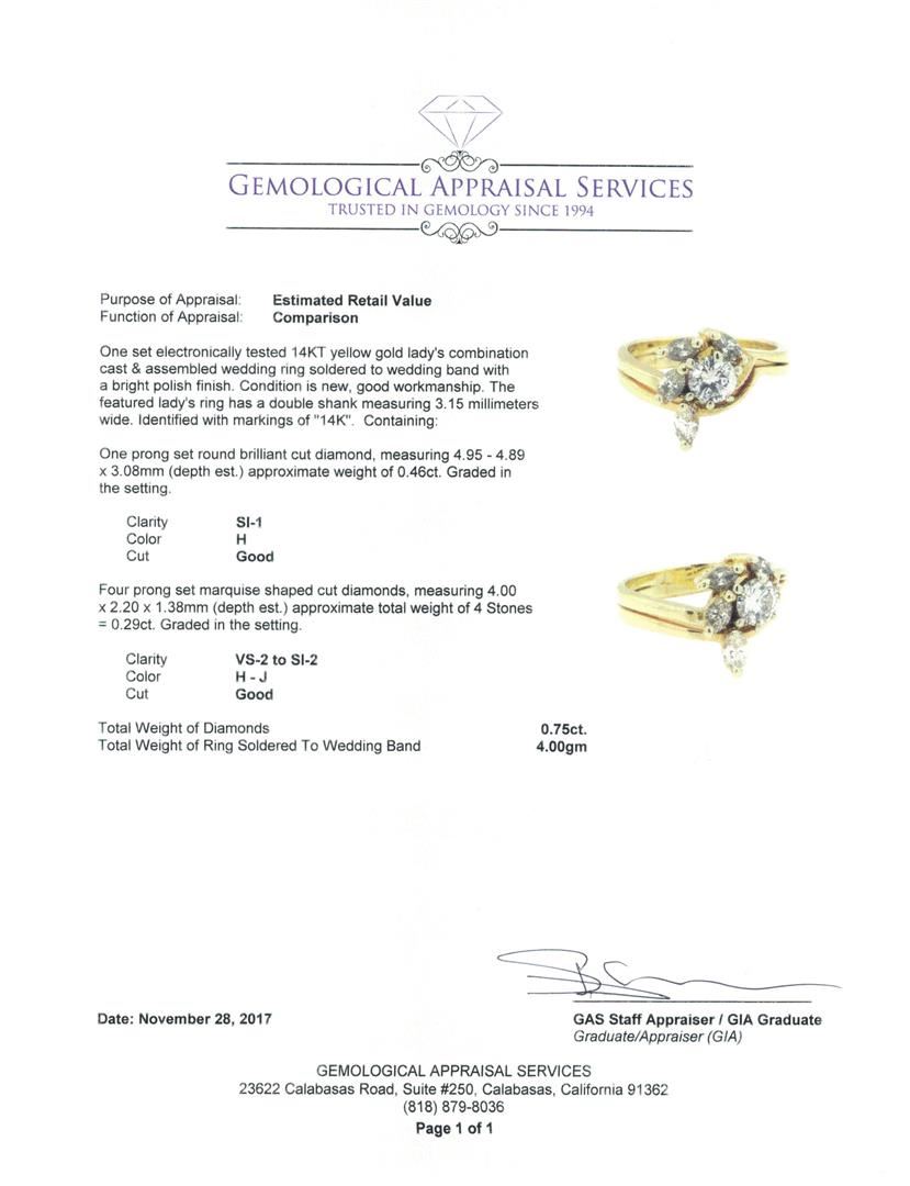 One set electronically tested 14KT yellow gold lady's combination cast & assembled wedding ring soldered to wedding band with a bright polish finish. The featured lady's ring has a double shank measuring 3.15 millimeters wide. Identified with markings of '14K'. Condition is new, good workmanship. Containing: One prong set round brilliant cut diamond, measuring 4.95 - 4.89 x 3.08mm (depth est.) approximate weight of 0.46ct. Graded in the setting. Color H Clarity SI-1 Cut Good Four prong set marquise shaped cut diamonds, measuring 4.00 x 2.20 x 1.38mm (depth est.) approximate total weight of 4 Stones = 0.29ct. Graded in the setting. Color H - J Clarity VS-2 to SI-2 Cut Good. Total Weight of Diamonds 0.75ct.. Total Weight of Ring Soldered To Wedding Band 4.00gm. GAS Appraised.