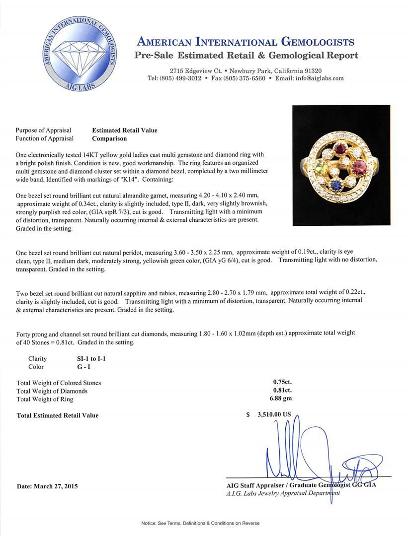 One electronically tested 14KT yellow gold ladies cast multi gemstone and diamond ring with a bright polish finish. The ring features an organized multi gemstone and diamond cluster set within a diamond bezel, completed by a two millimeter wide band. Identified with markings of "K14". Condition is new, good workmanship. Containing: One bezel set round brilliant cut natural almandite garnet, measuring 4.20 - 4.10 x 2.40 mm, approximate weight of 0.34ct., clarity is slightly included, type II, dark, very slightly brownish, strongly purplish red color, (GIA stpR 7/3), cut is good. Transmitting light with a minimum of distortion, transparent. Naturally occurring internal & external characteristics are present. Graded in the setting. One bezel set round brilliant cut natural peridot, measuring 3.60 - 3.50 x 2.25 mm, approximate weight of 0.19ct., clarity is eye clean, type II, medium dark, moderately strong, yellowish green color, (GIA yG 6/4), cut is good. Transmitting light with no distortion, transparent. Graded in the setting. Two bezel set round brilliant cut natural sapphire and rubies, measuring 2.80 - 2.70 x 1.79 mm, approximate total weight of 0.22ct., clarity is slightly included, cut is good. Transmitting light with a minimum of distortion, transparent. Naturally occurring internal & external characteristics are present. Graded in the setting. Forty prong and channel set round brilliant cut diamonds, measuring 1.80 - 1.60 x 1.02mm (depth est.) approximate total weight of 40 Stones = 0.81ct. Graded in the setting. Clarity: SI-1 to I-1. Color: G - I. Total Weight of Colored Stones 0.75ct. Total Weight of Diamonds 0.81ct. Total Weight of Ring 6.88 grams. AIG Appraised at $3,510.00.