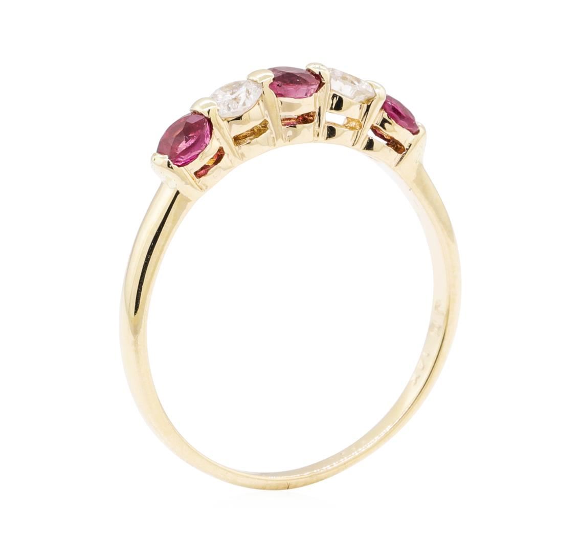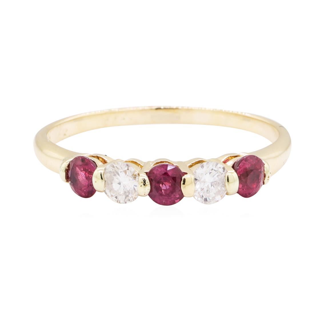 One five stone ring featuring: 14KT yellow gold weighing 2.2 grams containing rubies weighing 0.45ctw and diamonds weighing 0.30ctw. The ring is a size 9.