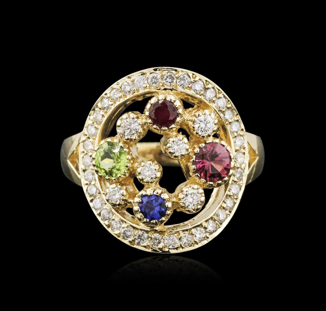 One electronically tested 14KT yellow gold ladies cast multi gemstone and diamond ring with a bright polish finish. The ring features an organized multi gemstone and diamond cluster set within a diamond bezel, completed by a two millimeter wide band. Identified with markings of "K14". Condition is new, good workmanship. Containing: One bezel set round brilliant cut natural almandite garnet, measuring 4.20 - 4.10 x 2.40 mm, approximate weight of 0.34ct., clarity is slightly included, type II, dark, very slightly brownish, strongly purplish red color, (GIA stpR 7/3), cut is good. Transmitting light with a minimum of distortion, transparent. Naturally occurring internal & external characteristics are present. Graded in the setting. One bezel set round brilliant cut natural peridot, measuring 3.60 - 3.50 x 2.25 mm, approximate weight of 0.19ct., clarity is eye clean, type II, medium dark, moderately strong, yellowish green color, (GIA yG 6/4), cut is good. Transmitting light with no distortion, transparent. Graded in the setting. Two bezel set round brilliant cut natural sapphire and rubies, measuring 2.80 - 2.70 x 1.79 mm, approximate total weight of 0.22ct., clarity is slightly included, cut is good. Transmitting light with a minimum of distortion, transparent. Naturally occurring internal & external characteristics are present. Graded in the setting. Forty prong and channel set round brilliant cut diamonds, measuring 1.80 - 1.60 x 1.02mm (depth est.) approximate total weight of 40 Stones = 0.81ct. Graded in the setting. Clarity: SI-1 to I-1. Color: G - I. Total Weight of Colored Stones 0.75ct. Total Weight of Diamonds 0.81ct. Total Weight of Ring 6.88 grams. AIG Appraised at $3,510.00.