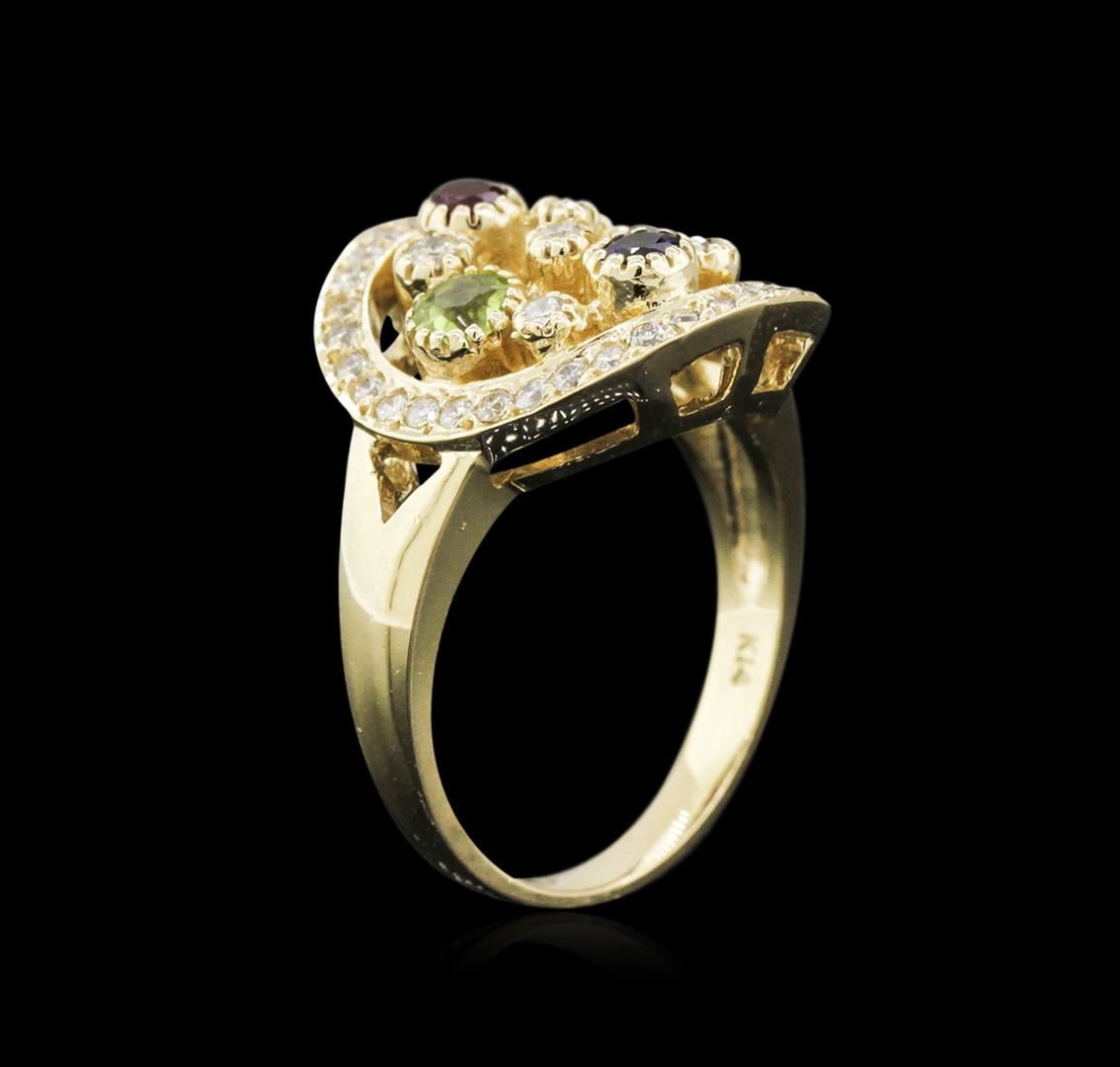 One electronically tested 14KT yellow gold ladies cast multi gemstone and diamond ring with a bright polish finish. The ring features an organized multi gemstone and diamond cluster set within a diamond bezel, completed by a two millimeter wide band. Identified with markings of "K14". Condition is new, good workmanship. Containing: One bezel set round brilliant cut natural almandite garnet, measuring 4.20 - 4.10 x 2.40 mm, approximate weight of 0.34ct., clarity is slightly included, type II, dark, very slightly brownish, strongly purplish red color, (GIA stpR 7/3), cut is good. Transmitting light with a minimum of distortion, transparent. Naturally occurring internal & external characteristics are present. Graded in the setting. One bezel set round brilliant cut natural peridot, measuring 3.60 - 3.50 x 2.25 mm, approximate weight of 0.19ct., clarity is eye clean, type II, medium dark, moderately strong, yellowish green color, (GIA yG 6/4), cut is good. Transmitting light with no distortion, transparent. Graded in the setting. Two bezel set round brilliant cut natural sapphire and rubies, measuring 2.80 - 2.70 x 1.79 mm, approximate total weight of 0.22ct., clarity is slightly included, cut is good. Transmitting light with a minimum of distortion, transparent. Naturally occurring internal & external characteristics are present. Graded in the setting. Forty prong and channel set round brilliant cut diamonds, measuring 1.80 - 1.60 x 1.02mm (depth est.) approximate total weight of 40 Stones = 0.81ct. Graded in the setting. Clarity: SI-1 to I-1. Color: G - I. Total Weight of Colored Stones 0.75ct. Total Weight of Diamonds 0.81ct. Total Weight of Ring 6.88 grams. AIG Appraised at $3,510.00.