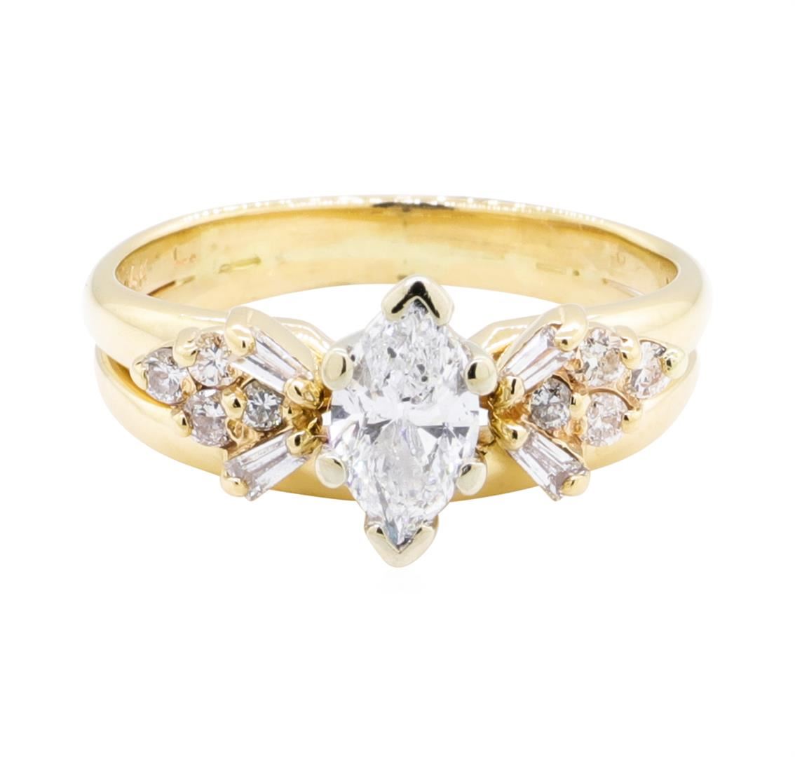 One electronically tested 14KT yellow gold lady's combination cast & assembled wedding ring soldered to wedding band with a bright polish finish. The featured lady's ring has a double shank measuring 2.80 millimeters wide. Identified with markings of '14K'. Condition is like new, good workmanship. Containing: One prong set marquise shaped cut diamond, measuring 7.30 x 4.20 x 2.65mm (depth est.) , 5.00.%. GTCF approximate weight of 0.50ct. Graded in the setting. Color F - G Clarity SI-2 Cut Good Four prong set baguette cut (tapered) diamonds, measuring from 2.10 x 1.20 x 1.02mm (depth est.) to 2.20 x 1.30 x 1.11mm (depth est.) approximate total weight of 4 Stones = 0.10ct. Graded in the setting. Color G - H Clarity VS-2 to SI-1 Cut Very Good Eight prong set round brilliant cut diamonds, measuring 1.90 - 1.70 x 1.12mm (depth est.) approximate total weight of 8 Stones = 0.18ct. Graded in the setting. Color G - H Clarity VS-2 to SI-2 Cut Good. Total Weight of Diamonds 0.78ct. Total Weight of Ring Soldered To Wedding Band 3.80gm. GAS Appraised.
