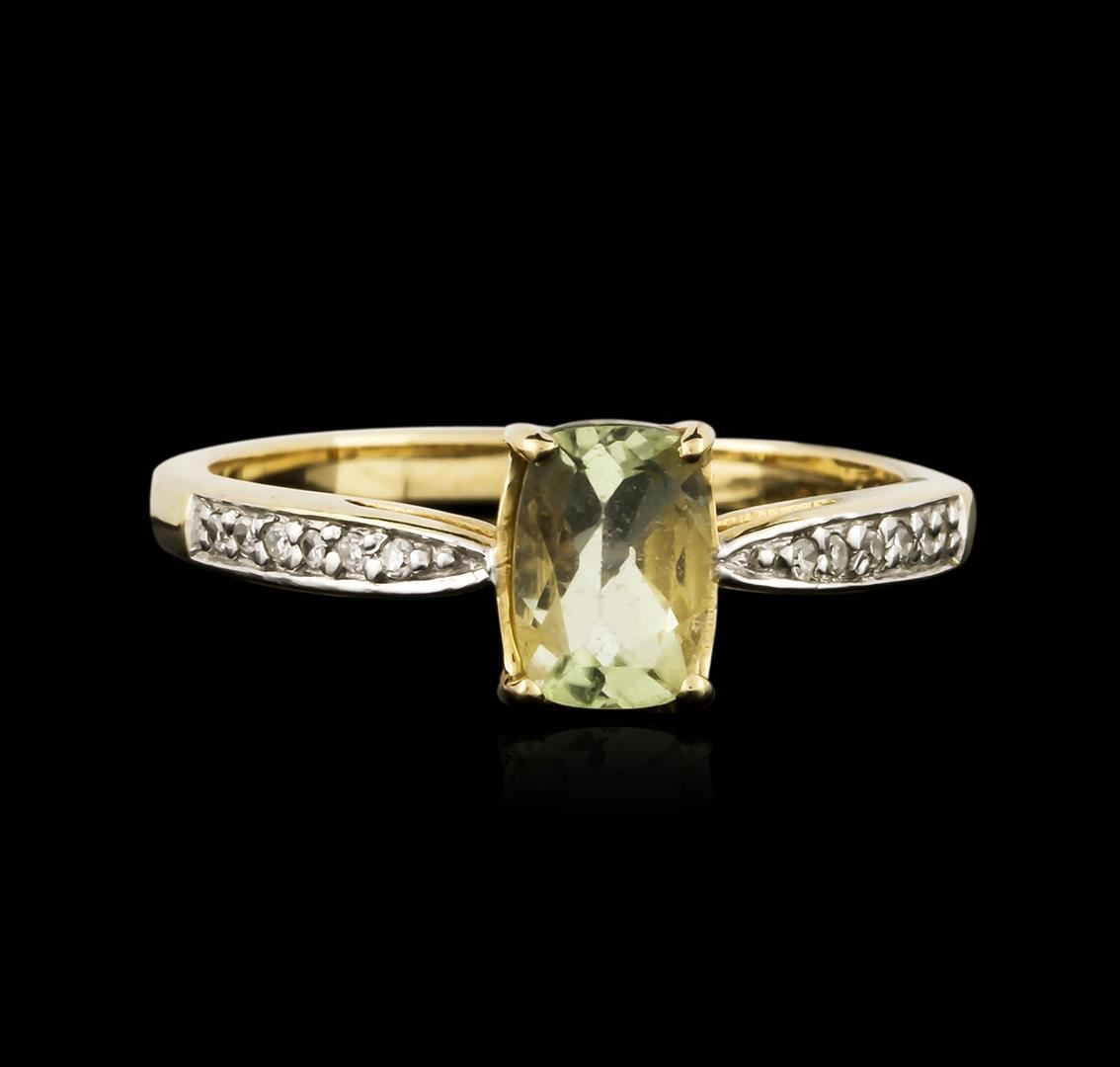 One electronically tested 14KT yellow gold ladies cast green tourmaline and diamond ring. The featured green tourmaline is supported by diamond set shoulders, completed by a one and one-half millimeter wide band. Bright polish finish with rhodium accents. Identified with markings of "14K". Condition is new, good workmanship. Containing: One prong set rectangular cushion mixed cut natural green tourmaline, measuring 6.80 x 4.70 x 3.25mm, 6%. bulge factor, approximate weight of 0.79ct., clarity is eye clean, type I, medium light, very slightly grayish, strongly yellowish green color, (GIA styG 4/3), cut is good. Transmitting light with no distortion, transparent. Refractive index testing results of 1.62 to 1.64. This is a conclusive result for tourmaline. Graded in the setting. Twelve prong set single cut diamonds, measuring 1.00 - 0.90 x 0.57mm (depth est.) approximate total weight of 12 Stones = 0.06ct. Graded in the setting. Clarity: SI-1 to SI-2. Color: H - I. Total Weight of Colored Stones 0.79ct. Total Weight of Diamonds 0.06ct. Total Weight of Ring 2.51 grams. AIG Appraised at $690.00.