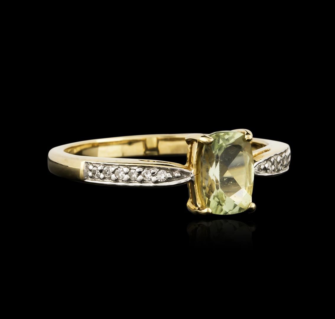 One electronically tested 14KT yellow gold ladies cast green tourmaline and diamond ring. The featured green tourmaline is supported by diamond set shoulders, completed by a one and one-half millimeter wide band. Bright polish finish with rhodium accents. Identified with markings of "14K". Condition is new, good workmanship. Containing: One prong set rectangular cushion mixed cut natural green tourmaline, measuring 6.80 x 4.70 x 3.25mm, 6%. bulge factor, approximate weight of 0.79ct., clarity is eye clean, type I, medium light, very slightly grayish, strongly yellowish green color, (GIA styG 4/3), cut is good. Transmitting light with no distortion, transparent. Refractive index testing results of 1.62 to 1.64. This is a conclusive result for tourmaline. Graded in the setting. Twelve prong set single cut diamonds, measuring 1.00 - 0.90 x 0.57mm (depth est.) approximate total weight of 12 Stones = 0.06ct. Graded in the setting. Clarity: SI-1 to SI-2. Color: H - I. Total Weight of Colored Stones 0.79ct. Total Weight of Diamonds 0.06ct. Total Weight of Ring 2.51 grams. AIG Appraised at $690.00.