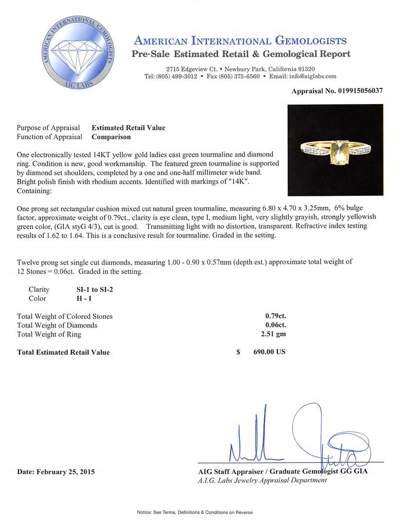 One electronically tested 14KT yellow gold ladies cast green tourmaline and diamond ring. The featured green tourmaline is supported by diamond set shoulders, completed by a one and one-half millimeter wide band. Bright polish finish with rhodium accents. Identified with markings of "14K". Condition is new, good workmanship. Containing: One prong set rectangular cushion mixed cut natural green tourmaline, measuring 6.80 x 4.70 x 3.25mm, 6%. bulge factor, approximate weight of 0.79ct., clarity is eye clean, type I, medium light, very slightly grayish, strongly yellowish green color, (GIA styG 4/3), cut is good. Transmitting light with no distortion, transparent. Refractive index testing results of 1.62 to 1.64. This is a conclusive result for tourmaline. Graded in the setting. Twelve prong set single cut diamonds, measuring 1.00 - 0.90 x 0.57mm (depth est.) approximate total weight of 12 Stones = 0.06ct. Graded in the setting. Clarity: SI-1 to SI-2. Color: H - I. Total Weight of Colored Stones 0.79ct. Total Weight of Diamonds 0.06ct. Total Weight of Ring 2.51 grams. AIG Appraised at $690.00.