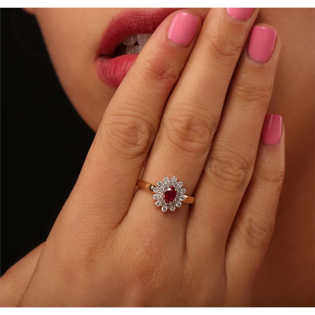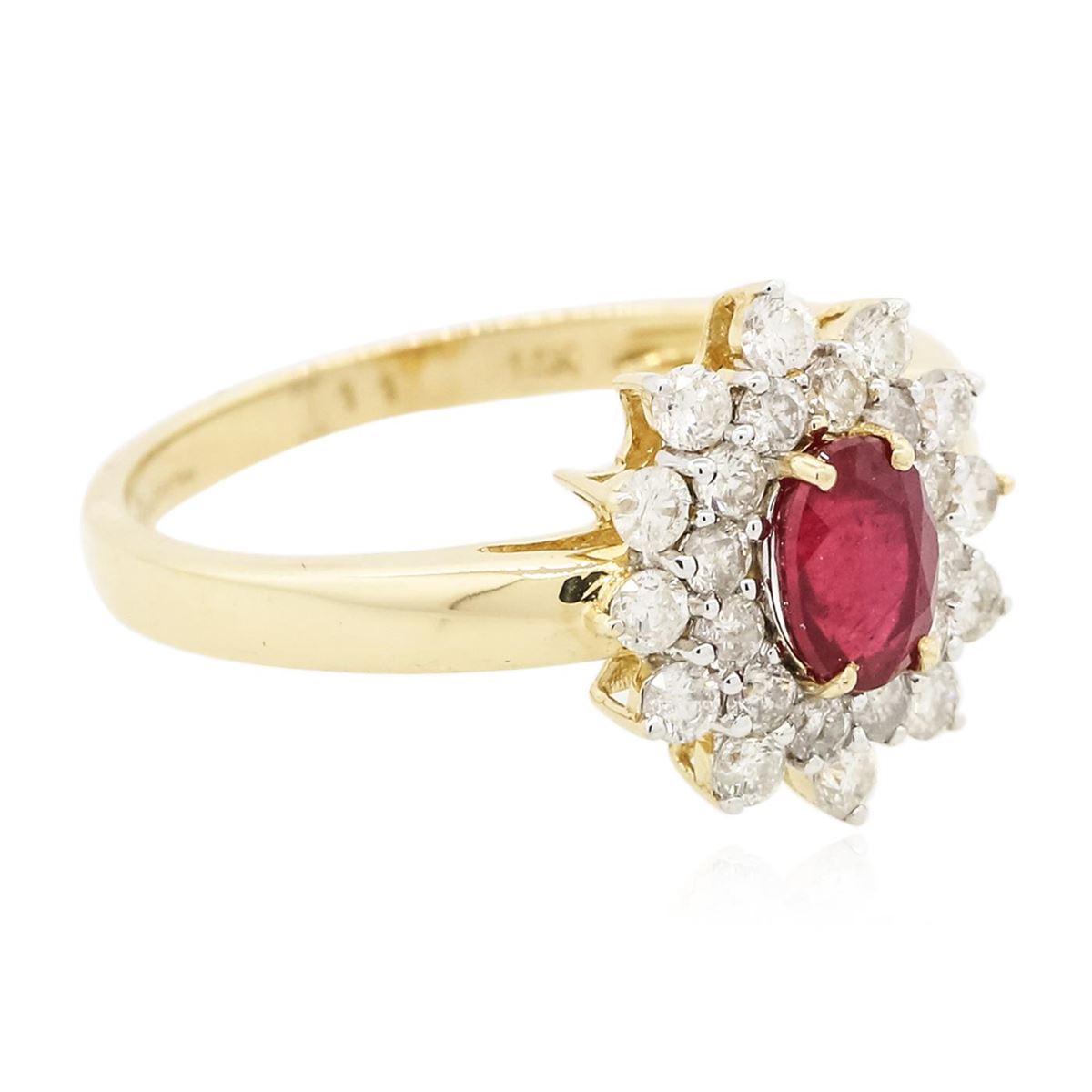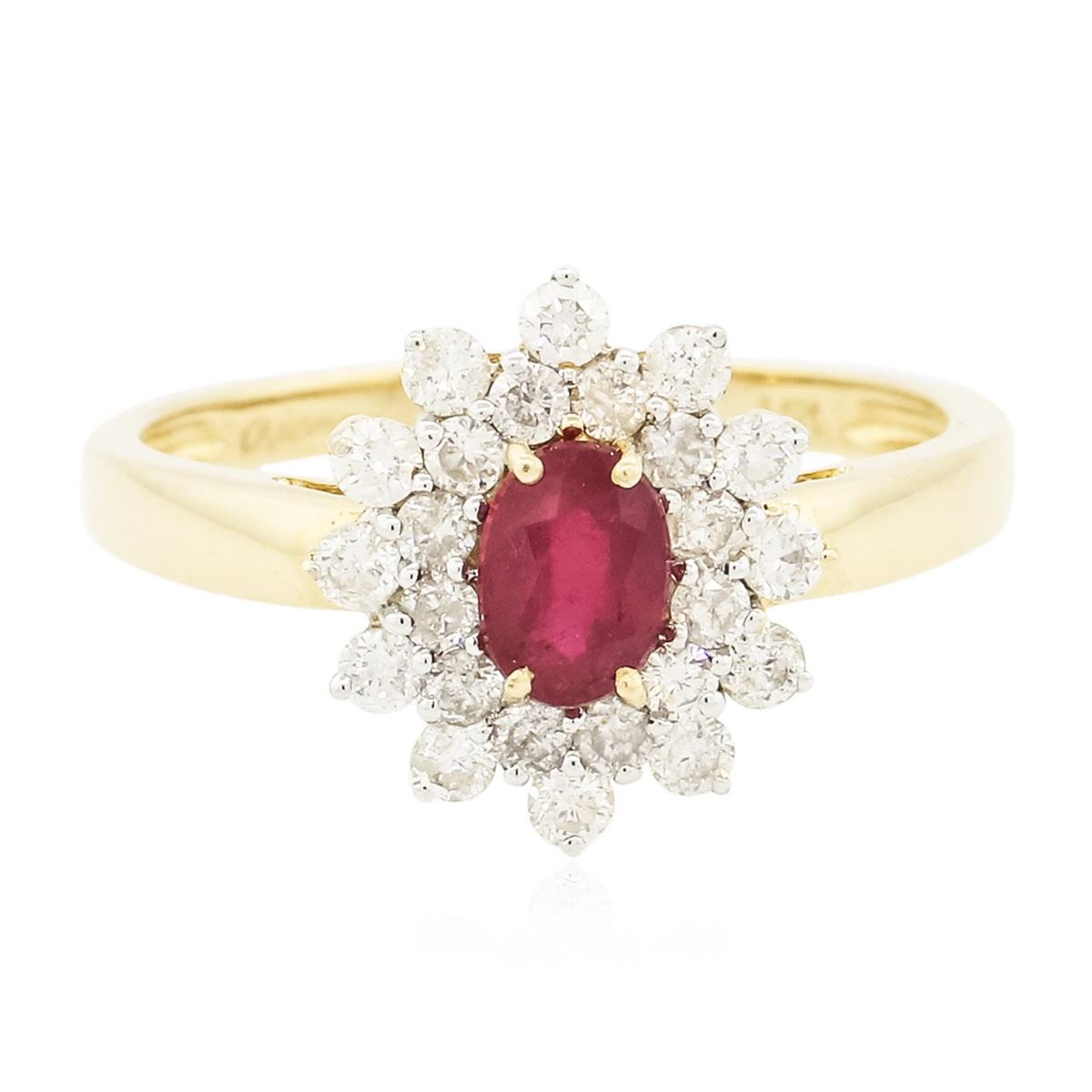 One 14KT yellow gold Ruby and Diamond ring weighing approx. 2.50 grams. Containing: One Oval cut Natural Ruby, pinkish Red (GIA rR 5/4) hue, medium tone, moderately strong saturation, Moderately Included - Type II (see below). 24 Round Brilliant cut Diamonds total approx. 0.58 carat, measuring approx. 1.60 to 1.80 mm, with an average quality of I1-I2; H-1 color grade. Gem type: natural ruby. Shape: oval cut. Carat weight: approx. 0.79 carat. Measurement: approx. 5.70 x 4.04 mm. Clarity: moderately included. Metal content: 14KT yellow gold. Setting: prong set. Comments: ruby indicates laboratory high temperature heat treatment, with glass and flux additives. GLA Appraised at $3,217.00.