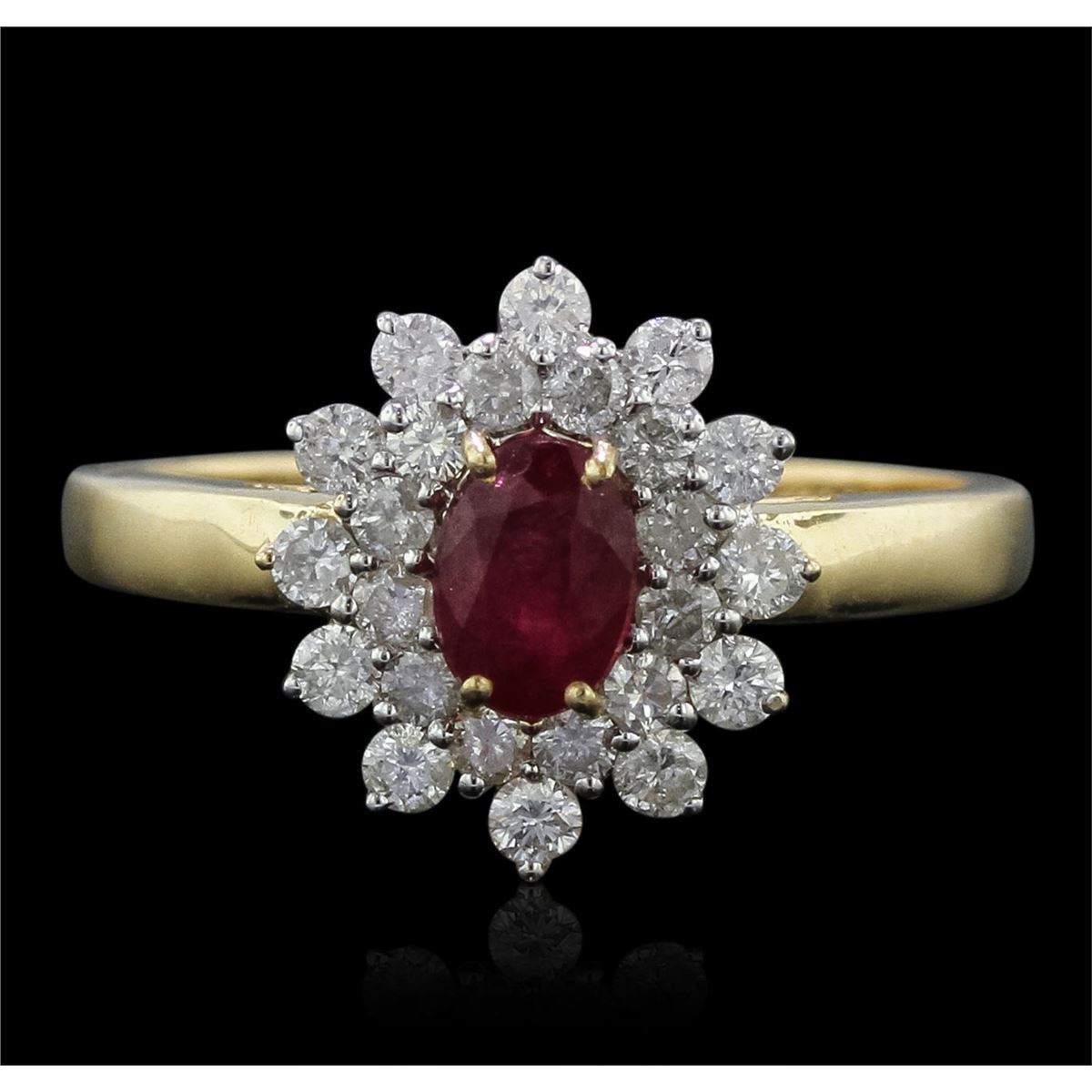 One 14KT yellow gold Ruby and Diamond ring weighing approx. 2.50 grams. Containing: One Oval cut Natural Ruby, pinkish Red (GIA rR 5/4) hue, medium tone, moderately strong saturation, Moderately Included - Type II (see below). 24 Round Brilliant cut Diamonds total approx. 0.58 carat, measuring approx. 1.60 to 1.80 mm, with an average quality of I1-I2; H-1 color grade. Gem type: natural ruby. Shape: oval cut. Carat weight: approx. 0.79 carat. Measurement: approx. 5.70 x 4.04 mm. Clarity: moderately included. Metal content: 14KT yellow gold. Setting: prong set. Comments: ruby indicates laboratory high temperature heat treatment, with glass and flux additives. GLA Appraised at $3,217.00.