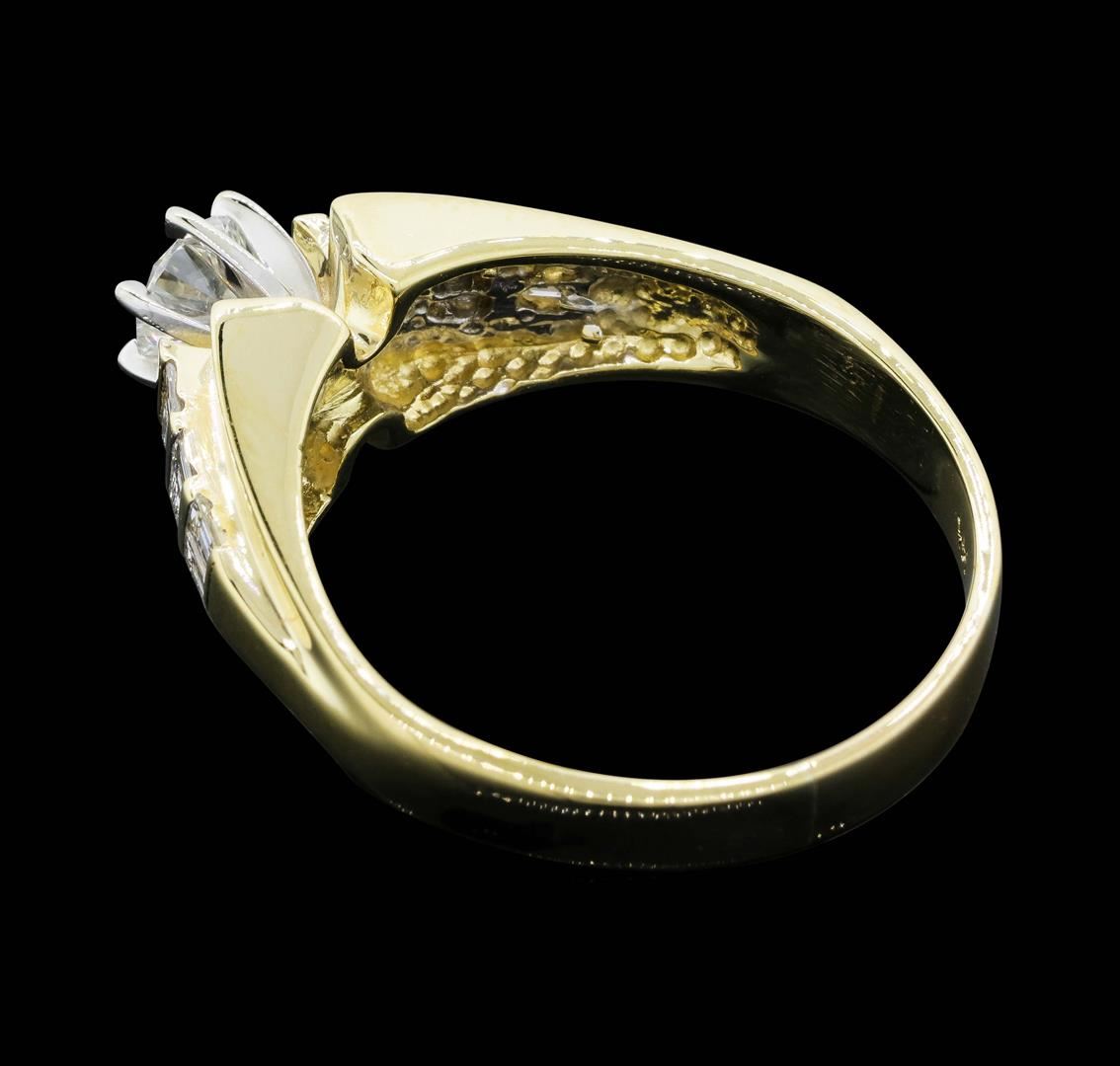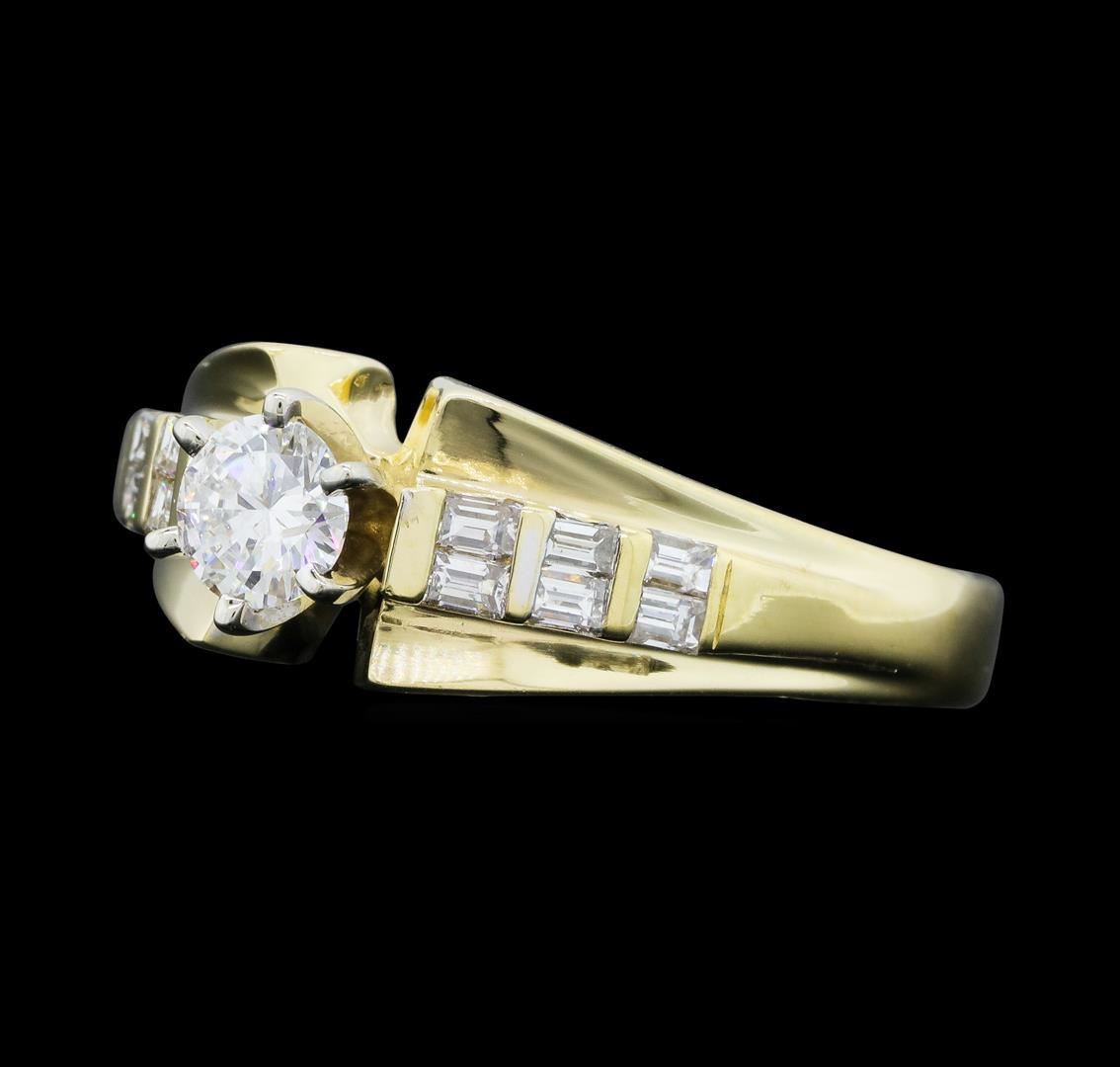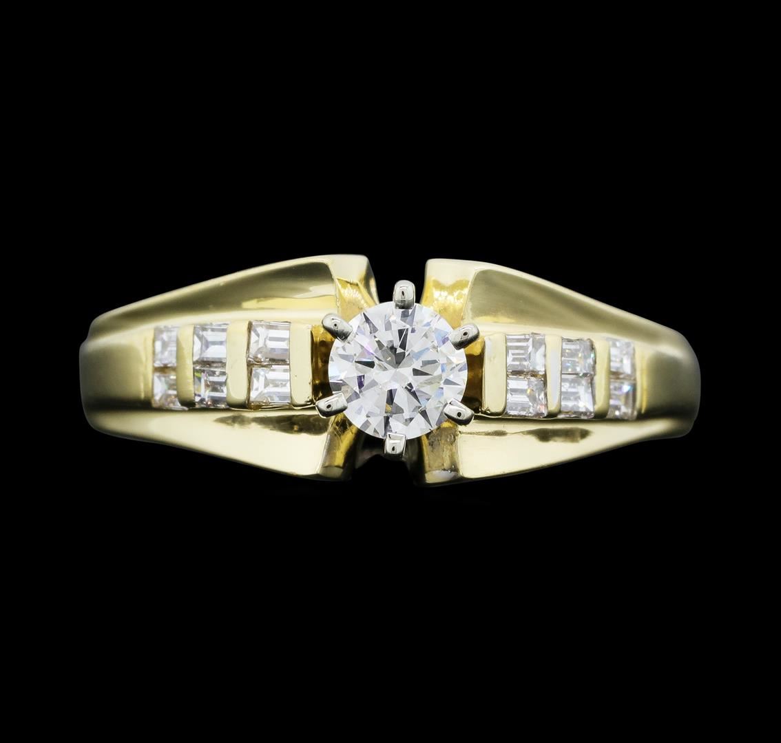 One electronically tested 14KT yellow gold lady's cast fashion ring with a cathedral shank with a bright polish finish. The featured lady's ring has a shank measuring 3.17 millimeters wide. Identified with markings of "14K". Condition is new, good workmanship. Containing: One prong set round brilliant cut diamond, measuring 4.67 - 4.63 x 2.88mm (depth est.) approximate weight of 0.40ct. Graded in the setting. Color G, Clarity I-1 Cut Good Twelve channel set baguette cut diamonds, measuring from 2.00 x 1.40 x 1.19mm (depth est.) to 2.20 x 1.50 x 1.28mm (depth est.) approximate total weight of 12 Stones = 0.42ct. Graded in the setting. Color H - I Clarity SI-1 to I-1 Cut Very Good. Total Weight of Diamonds 0.82ct. Total Weight of Ring 5.10gm. GAS Appraised.