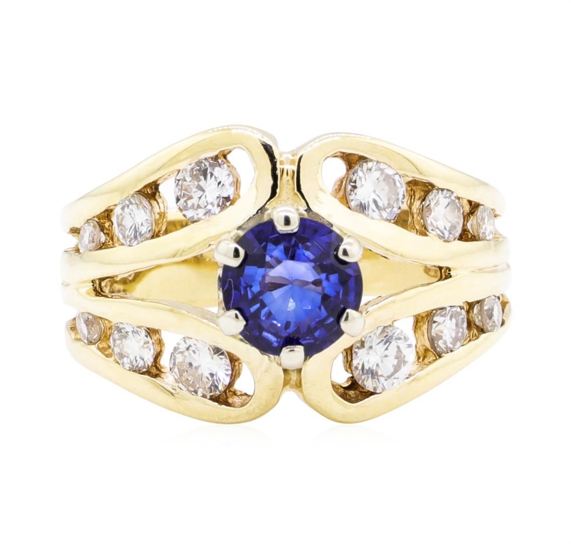 One ring featuring: 14KT yellow gold weighing 5.5 grams containing one sapphire weighing 0.83ct and diamonds weighing 0.65ctw. The ring is a size 6.