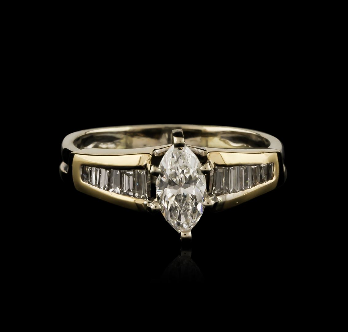 One electronically tested 14KT yellow gold ladies cast diamond engagement ring with a bright polish finish. Condition is new. Containing: One prong set marquise shaped cut diamond, measuring 8.30 x 4.50 x 2.84mm (depth est.) approximate weight of 0.62ct. Clarity: SI-2. Color: I, Cut is Good. Twelve channel set baguette cut diamonds, measuring from 1.00 x 1.00 x 0.85mm (depth est.) to 2.00 x 1.50 x 1.28mm (depth est.) approximate total weight of 12 Stones = 0.22ct. Clarity: VS-2. Color: H - I, Cut is Good. All diamonds are graded in the mounting, unless otherwise stated. Total Weight of Diamonds 0.83ct. Total Weight of Engagement Ring 4.60 grams. GGL Appraised at $4,805.00.