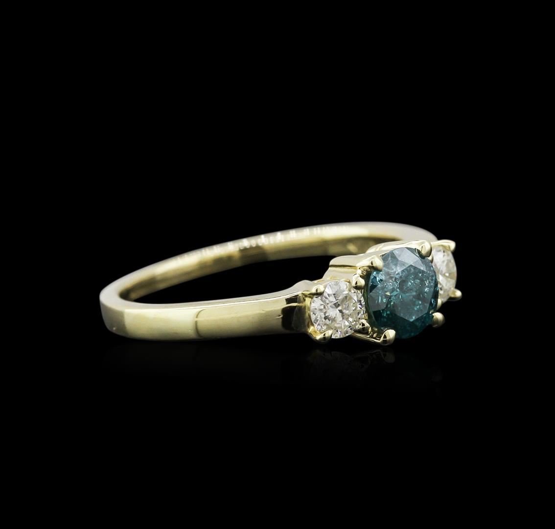 One electronically tested 14KT yellow gold ladies cast diamond ring with a flat shank with rounded edges with a bright polish finish. Identified with markings of "14K". Condition is normal wear. Containing: One prong set round brilliant cut diamond, measuring 5.23 - 5.20 x 3.13mm (depth est.) exact weight 0.55ct. Clarity: I-2, Cut is Good. The diamond has been color enhanced. Two prong set round brilliant cut diamonds, measuring 3.27 - 3.21 x 1.94mm (depth est.) exact total weight 2 Stones = 0.30ct. Clarity: I-1 to I-2. Color: I - J, Cut is Good. Diamonds are graded in the mounting, unless otherwise stated. Total Weight of Diamonds 0.85ct. Total Weight of Ring 3.10 grams. GGL Appraised at $1,345.00.