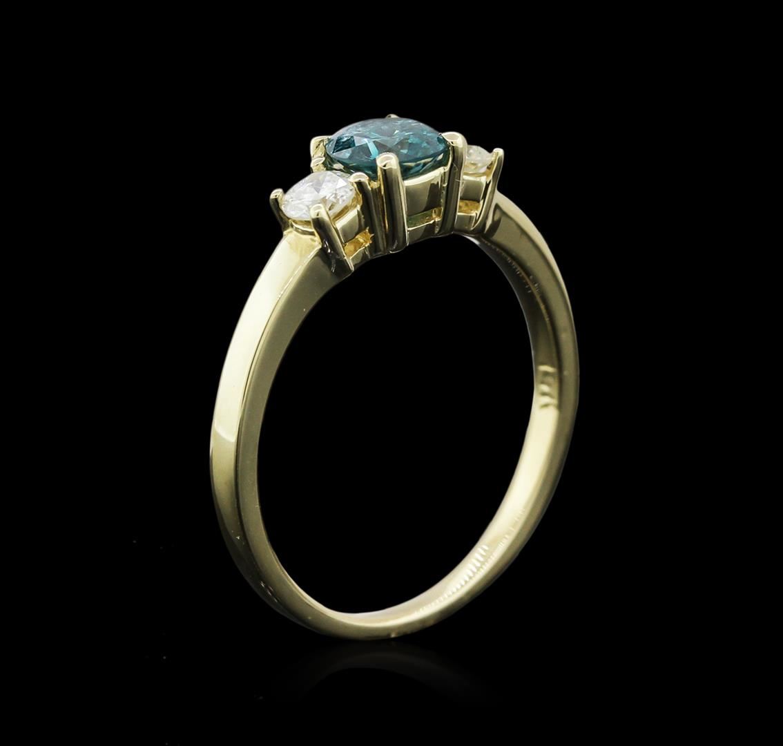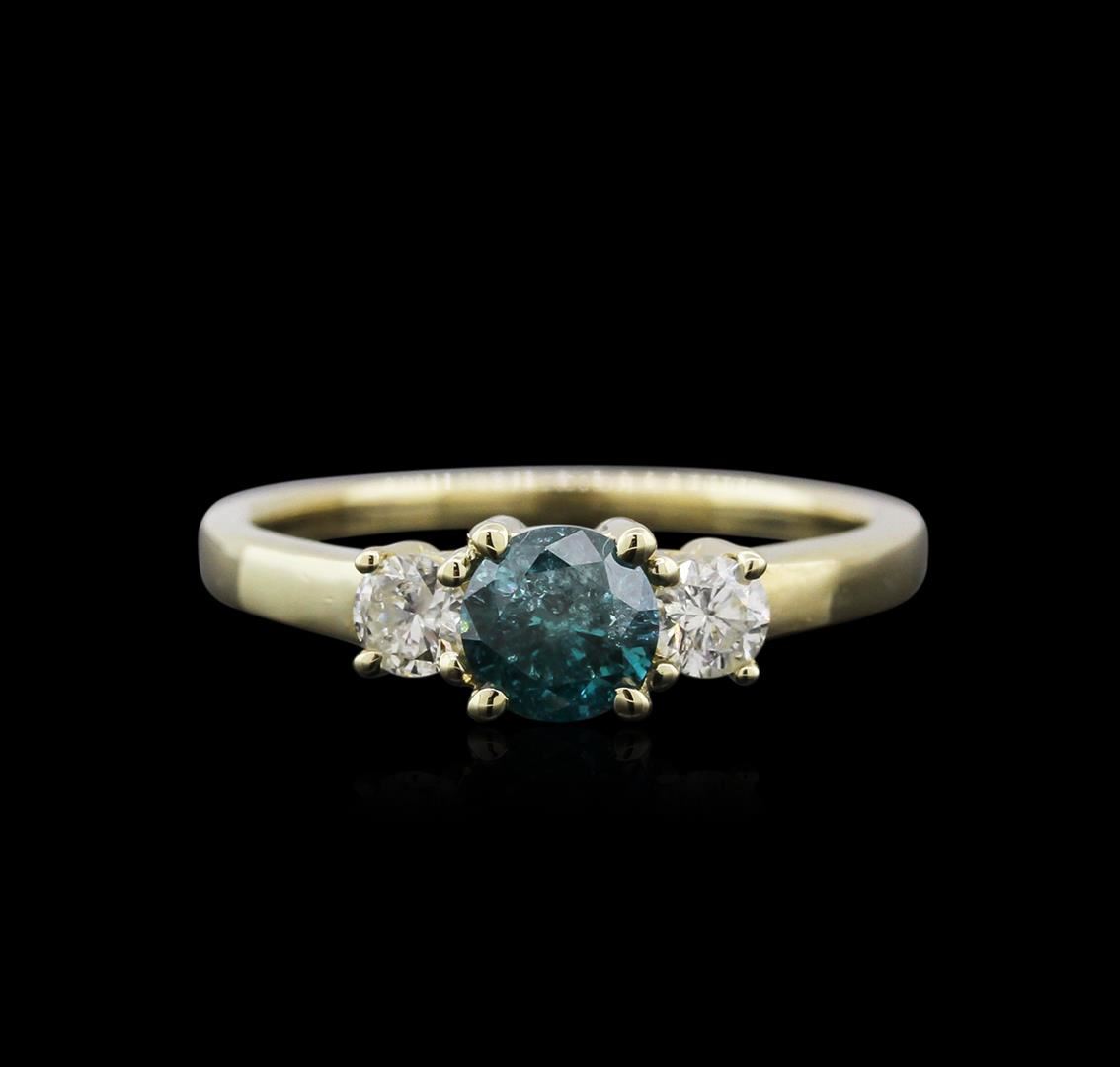 One electronically tested 14KT yellow gold ladies cast diamond ring with a flat shank with rounded edges with a bright polish finish. Identified with markings of "14K". Condition is normal wear. Containing: One prong set round brilliant cut diamond, measuring 5.23 - 5.20 x 3.13mm (depth est.) exact weight 0.55ct. Clarity: I-2, Cut is Good. The diamond has been color enhanced. Two prong set round brilliant cut diamonds, measuring 3.27 - 3.21 x 1.94mm (depth est.) exact total weight 2 Stones = 0.30ct. Clarity: I-1 to I-2. Color: I - J, Cut is Good. Diamonds are graded in the mounting, unless otherwise stated. Total Weight of Diamonds 0.85ct. Total Weight of Ring 3.10 grams. GGL Appraised at $1,345.00.