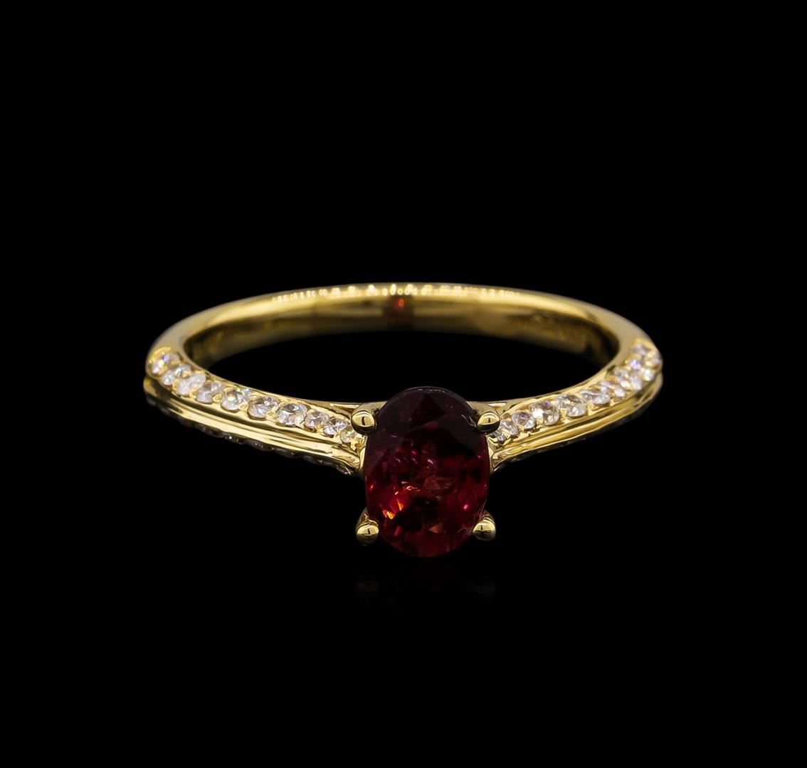 One electronically tested 14KT yellow gold ladies cast tourmaline and diamond ring with a bright polish finish. Condition is new, good workmanship. The featured tourmaline is cathedral set supported by diamond set shoulders, completed by a two millimeter wide band. Trademark is Orianne. Identified with markings of "14K". Containing: One prong set oval mixed cut natural rubellite, measuring 6.80 x 4.90 x 3.85mm, 6%. bulge factor, approximate weight of 0.85ct., clarity is slightly included, type III, medium dark, very slightly brownish, strongly purplish red color, (GIA stpR 6/3), cut is good. Transmitting light with a minimum of distortion, transparent. Naturally occurring internal & external characteristics are present. Graded in the setting. Forty pav, set round brilliant cut diamonds, measuring 1.30 - 1.00 x 0.69mm (depth est.) approximate. Total Weight of 40 Stones = 0.32ct. Graded in the setting. Clarity: SI-1 to I-1. Color: G - I. Total Weight of Colored Stones 0.85ct. Total Weight of Diamonds 0.32ct. Total Weight of Ring 2.40 grams. AIG Appraised at $2,110.00.