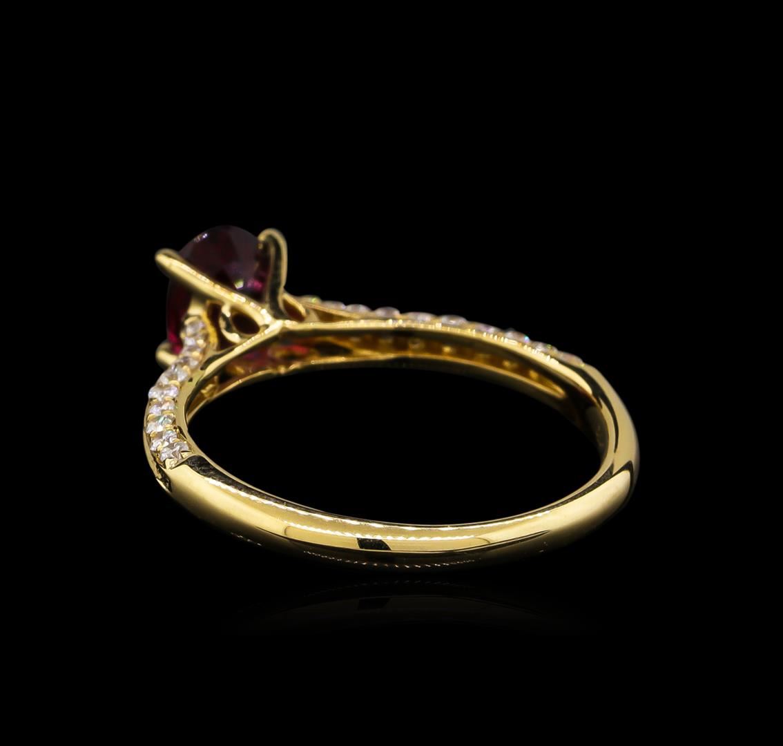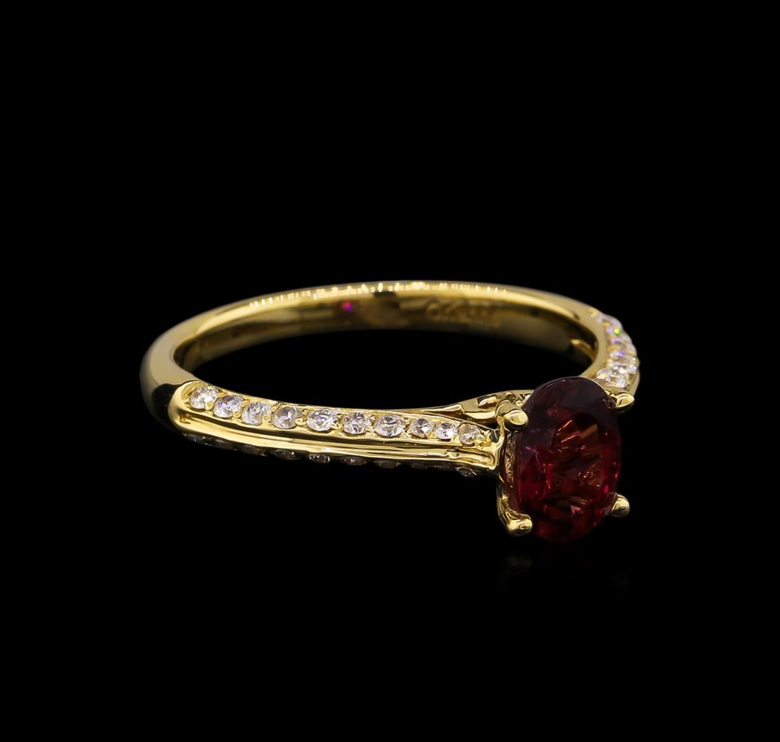 One electronically tested 14KT yellow gold ladies cast tourmaline and diamond ring with a bright polish finish. Condition is new, good workmanship. The featured tourmaline is cathedral set supported by diamond set shoulders, completed by a two millimeter wide band. Trademark is Orianne. Identified with markings of "14K". Containing: One prong set oval mixed cut natural rubellite, measuring 6.80 x 4.90 x 3.85mm, 6%. bulge factor, approximate weight of 0.85ct., clarity is slightly included, type III, medium dark, very slightly brownish, strongly purplish red color, (GIA stpR 6/3), cut is good. Transmitting light with a minimum of distortion, transparent. Naturally occurring internal & external characteristics are present. Graded in the setting. Forty pav, set round brilliant cut diamonds, measuring 1.30 - 1.00 x 0.69mm (depth est.) approximate. Total Weight of 40 Stones = 0.32ct. Graded in the setting. Clarity: SI-1 to I-1. Color: G - I. Total Weight of Colored Stones 0.85ct. Total Weight of Diamonds 0.32ct. Total Weight of Ring 2.40 grams. AIG Appraised at $2,110.00.