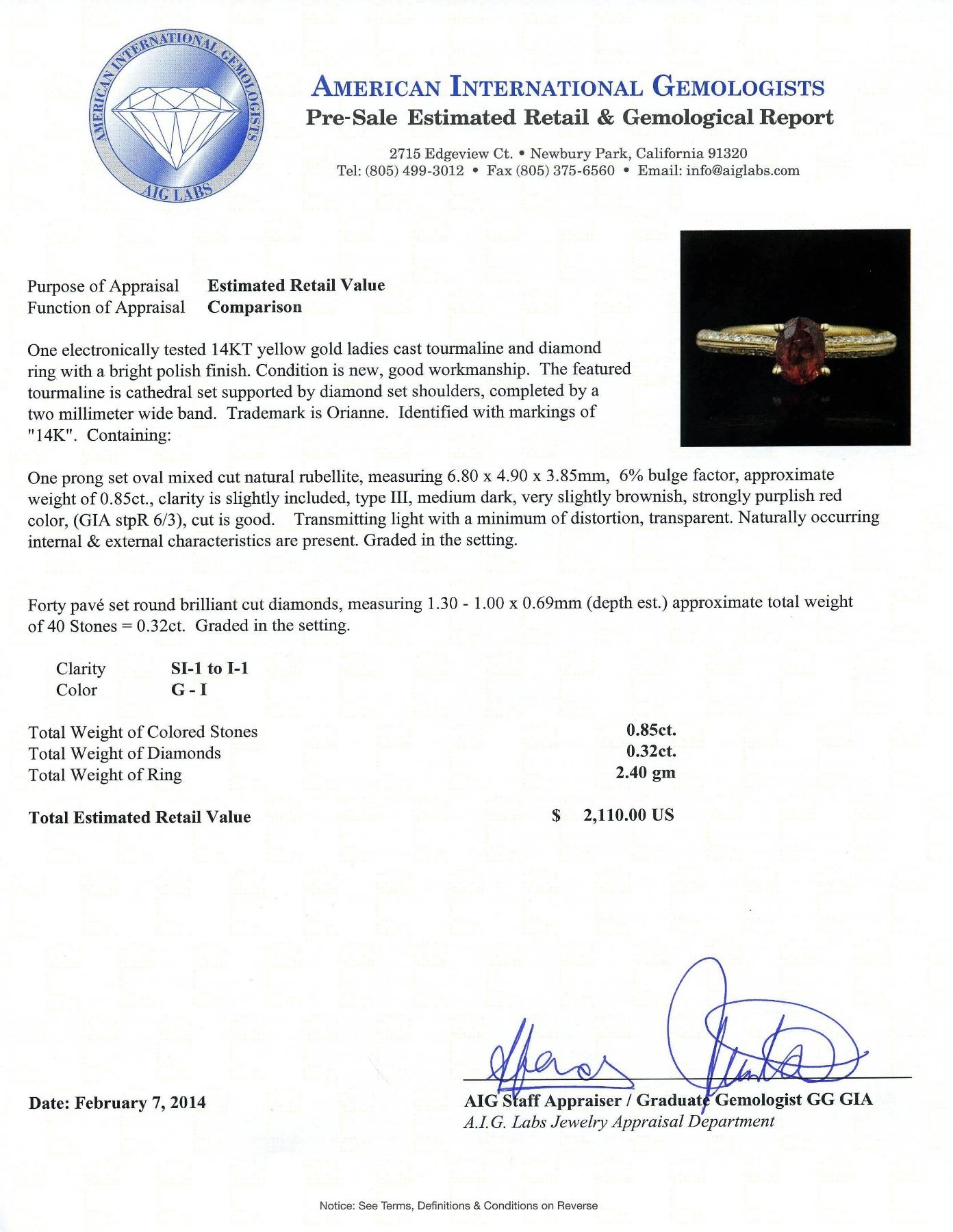 One electronically tested 14KT yellow gold ladies cast tourmaline and diamond ring with a bright polish finish. Condition is new, good workmanship. The featured tourmaline is cathedral set supported by diamond set shoulders, completed by a two millimeter wide band. Trademark is Orianne. Identified with markings of "14K". Containing: One prong set oval mixed cut natural rubellite, measuring 6.80 x 4.90 x 3.85mm, 6%. bulge factor, approximate weight of 0.85ct., clarity is slightly included, type III, medium dark, very slightly brownish, strongly purplish red color, (GIA stpR 6/3), cut is good. Transmitting light with a minimum of distortion, transparent. Naturally occurring internal & external characteristics are present. Graded in the setting. Forty pav, set round brilliant cut diamonds, measuring 1.30 - 1.00 x 0.69mm (depth est.) approximate. Total Weight of 40 Stones = 0.32ct. Graded in the setting. Clarity: SI-1 to I-1. Color: G - I. Total Weight of Colored Stones 0.85ct. Total Weight of Diamonds 0.32ct. Total Weight of Ring 2.40 grams. AIG Appraised.