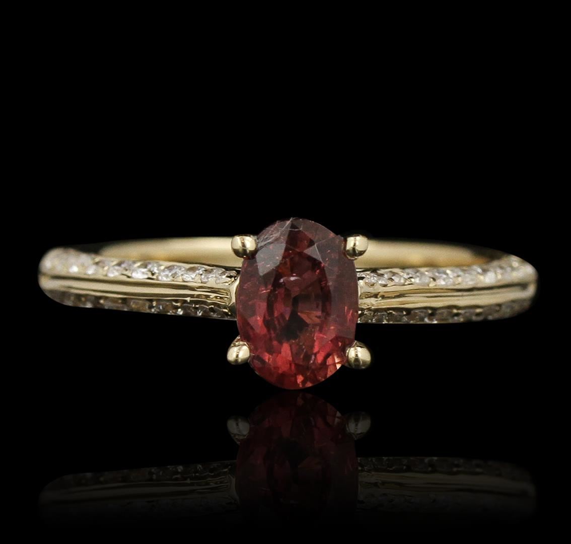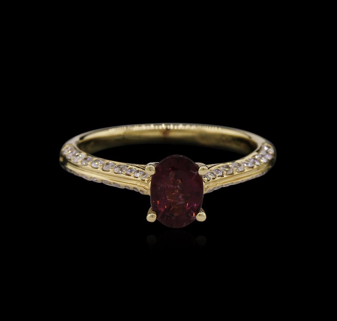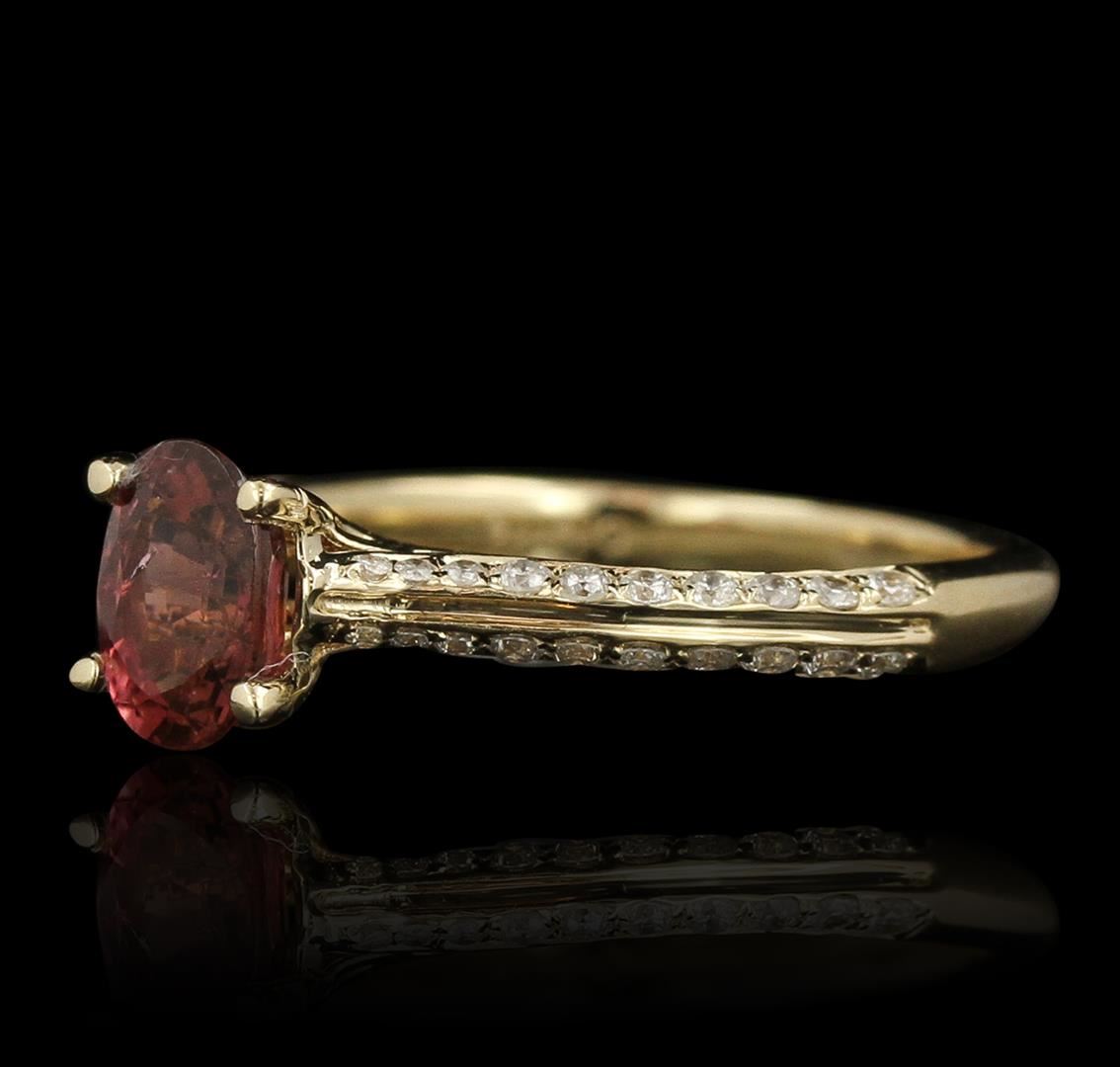 One electronically tested 14KT yellow gold ladies cast tourmaline and diamond ring with a bright polish finish. Condition is new, good workmanship. The featured tourmaline is cathedral set supported by diamond set shoulders, completed by a two millimeter wide band. Trademark is Orianne. Identified with markings of "14K". Containing: One prong set oval mixed cut natural rubellite, measuring 6.80 x 4.90 x 3.85mm, 6%. bulge factor, approximate weight of 0.85ct., clarity is slightly included, type III, medium dark, very slightly brownish, strongly purplish red color, (GIA stpR 6/3), cut is good. Transmitting light with a minimum of distortion, transparent. Naturally occurring internal & external characteristics are present. Graded in the setting. Forty pav, set round brilliant cut diamonds, measuring 1.30 - 1.00 x 0.69mm (depth est.) approximate. Total Weight of 40 Stones = 0.32ct. Graded in the setting. Clarity: SI-1 to I-1. Color: G - I. Total Weight of Colored Stones 0.85ct. Total Weight of Diamonds 0.32ct. Total Weight of Ring 2.40 grams. AIG Appraised at $2,110.00.