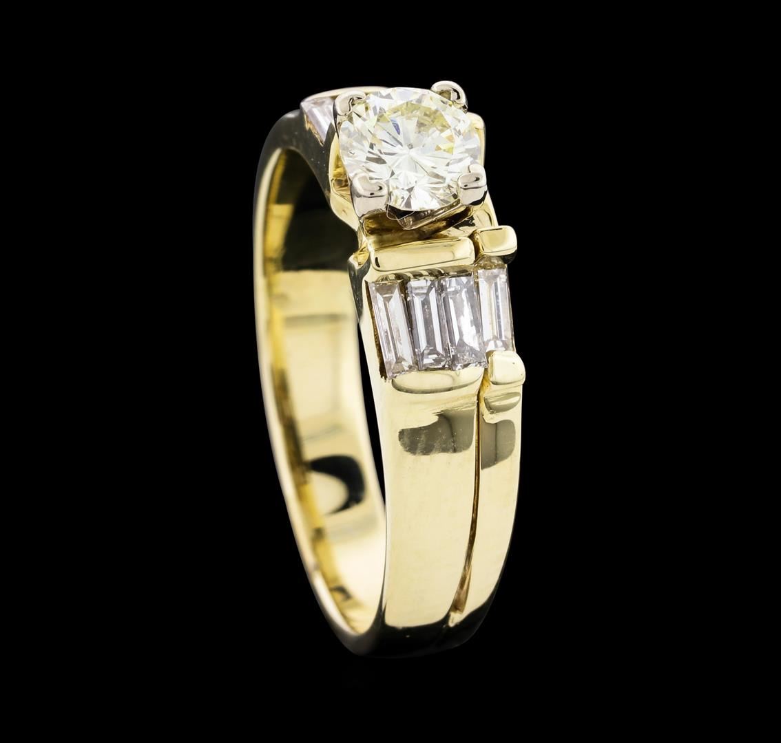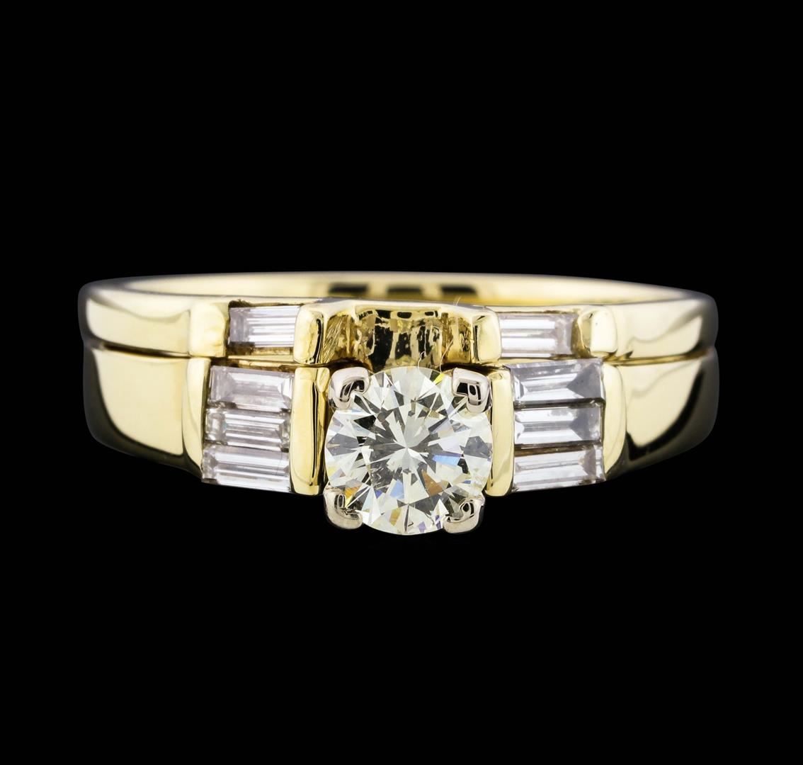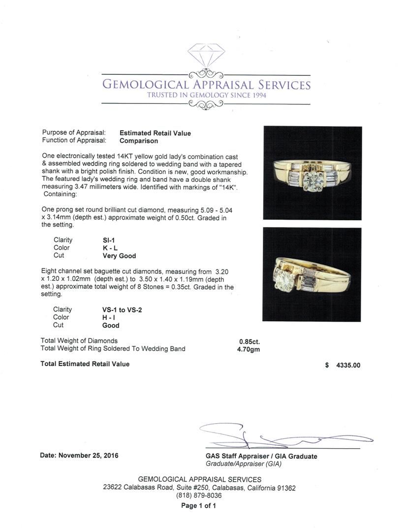 One electronically tested 14KT yellow gold lady's combination cast & assembled wedding ring soldered to wedding band with a tapered shank with a bright polish finish. The featured lady's wedding ring and band have a double shank measuring 3.47 millimeters wide. Identified with markings of "14K". Condition is new, good workmanship. Containing: One prong set round brilliant cut diamond, measuring 5.09 - 5.04 x 3.14mm (depth est.) approximate weight of 0.50ct. Graded in the setting. Clarity: SI-1. Color: K - LCut Very Good Eight channel set baguette cut diamonds, measuring from 3.20 x 1.20 x 1.02mm (depth est.) to 3.50 x 1.40 x 1.19mm (depth est.) approximate total weight of 8 Stones = 0.35ct. Graded in the setting. Clarity: VS-1 to VS-2. Color: H - ICut Good. Total Weight of Diamonds 0.85ct. Total Weight of Ring Soldered To Wedding Band 4.70gm. GAS Appraised at $4,335.00.