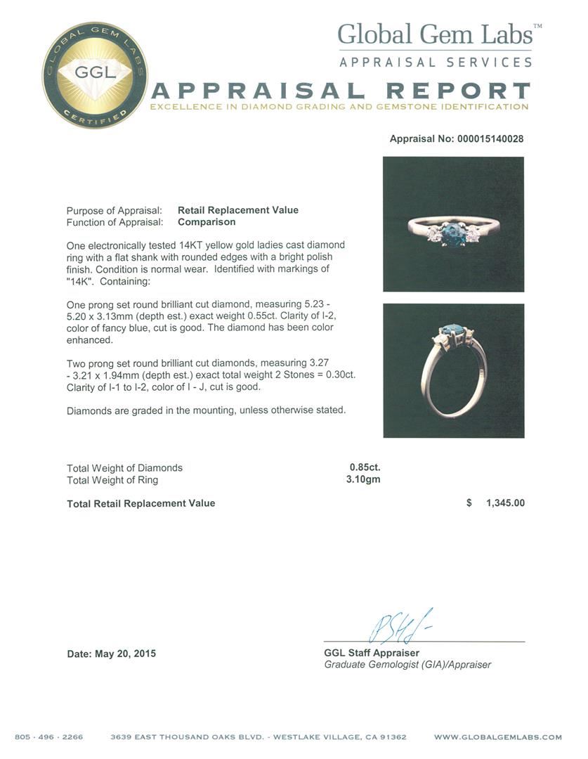One electronically tested 14KT yellow gold ladies cast diamond ring with a flat shank with rounded edges with a bright polish finish. Identified with markings of "14K". Condition is normal wear. Containing: One prong set round brilliant cut diamond, measuring 5.23 - 5.20 x 3.13mm (depth est.) exact weight 0.55ct. Clarity: I-2, Cut is Good. The diamond has been color enhanced. Two prong set round brilliant cut diamonds, measuring 3.27 - 3.21 x 1.94mm (depth est.) exact total weight 2 Stones = 0.30ct. Clarity: I-1 to I-2. Color: I - J, Cut is Good. Diamonds are graded in the mounting, unless otherwise stated. Total Weight of Diamonds 0.85ct. Total Weight of Ring 3.10 grams. GGL Appraised at $1,345.00.