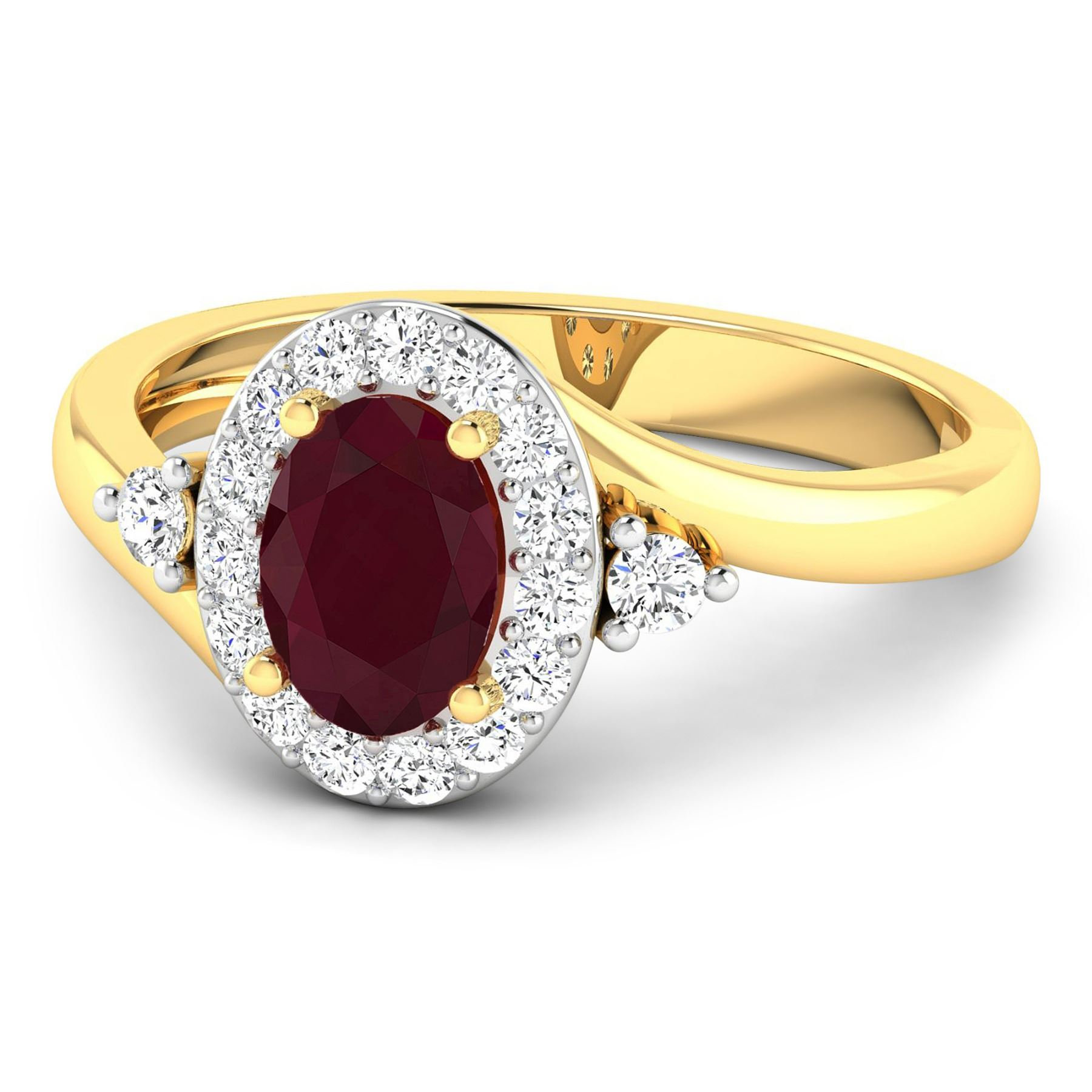 Ruby (AA) Oval 7x5mm - 1Pc + White Diamond F/C Round 2.00mm - 2Pcs + White Diamond F/C Round 1.50mm - 15Pcs ( White Pan Rhodium ) ( I1-I2/I color ) Total weight of gemstone is 0.85cts. Total Diamond weight is 0.27cts. Total weight of this ring is 2.73 grams. Ring size 7.