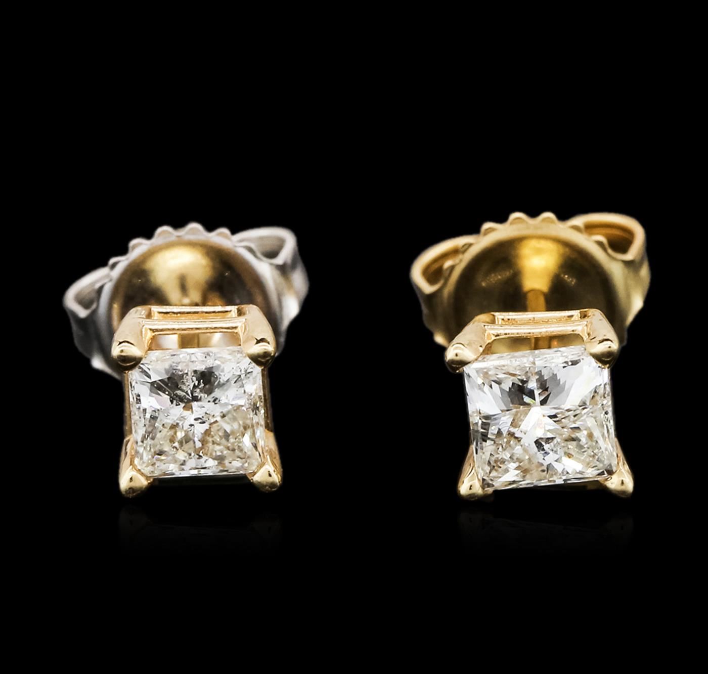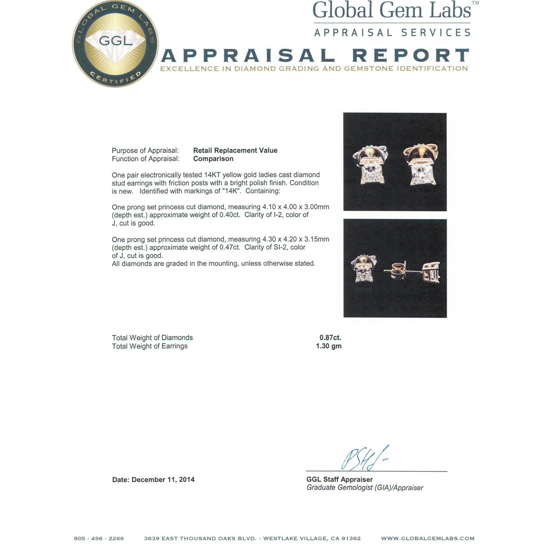 One pair electronically tested 14KT yellow gold ladies cast diamond stud earrings with friction posts with a bright polish finish. Identified with markings of "14K". Condition is new. Containing: One prong set princess cut diamond, measuring 4.10 x 4.00 x 3.00mm (depth est.) approximate weight of 0.40ct. Clarity: I-2. Color: J, Cut is Good. One prong set princess cut diamond, measuring 4.30 x 4.20 x 3.15mm (depth est.) approximate weight of 0.47ct. Clarity: SI-2. Color: J, Cut is Good. All diamonds are graded in the mounting, unless otherwise stated. Total Weight of Diamonds 0.87ct. Total Weight of Earrings 1.30 grams. GGL Appraised at $2,795.00.