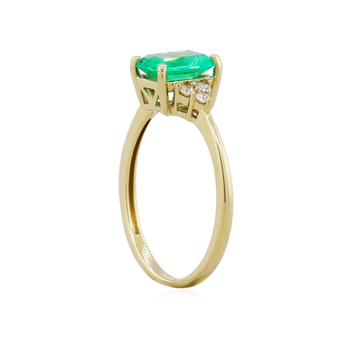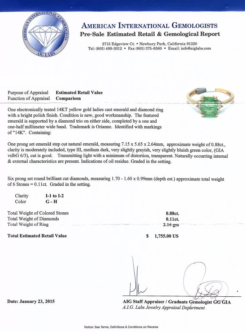 One electronically tested 14KT yellow gold ladies cast emerald and diamond ring with a bright polish finish. The featured emerald is supported by a diamond trio on either side, completed by a one and one-half millimeter wide band. Trademark is Orianne. Identified with markings of "14K". Condition is new, good workmanship. Containing: One prong set emerald step cut natural emerald, measuring 7.15 x 5.65 x 2.64mm, approximate weight of 0.88ct., clarity is moderately included, type III, medium dark, very slightly grayish, very slightly bluish green color, (GIA vslbG 6/3), cut is good. Transmitting light with a minimum of distortion, transparent. Naturally occurring internal & external characteristics are present. Indications of oil residue. Graded in the setting.Six prong set round brilliant cut diamonds, measuring 1.70 - 1.60 x 0.99mm (depth est.) approximate. Total Weight of 6 Stones = 0.11ct. Graded in the setting. Clarity: I-1 to I-2. Color: G - H. Total Weight of Colored Stones 0.88ct. Total Weight of Diamonds 0.11ct. AIG Appraised at $1,755.00.