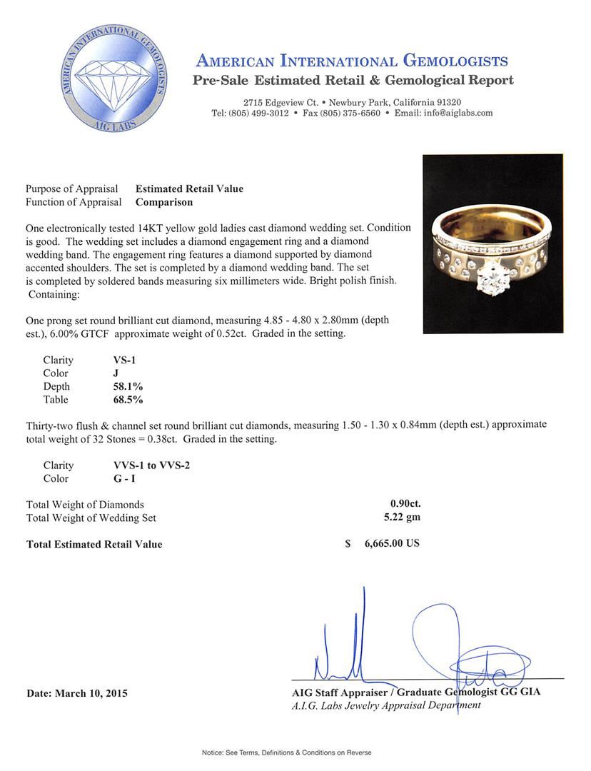 One electronically tested 14KT yellow gold ladies cast diamond wedding set. The wedding set includes a diamond engagement ring and a diamond wedding band. The engagement ring features a diamond supported by diamond accented shoulders. The set is completed by a diamond wedding band. The set is completed by soldered bands measuring six millimeters wide. Bright polish finish. Condition is good. Containing: One prong set round brilliant cut diamond, measuring 4.85 - 4.80 x 2.80mm (depth est.), 6.00.%. GTCF approximate weight of 0.52ct. Graded in the setting. Clarity: VS-1. Color: J. Depth 58.1%. Table 68.5%. Thirty-Two flush & channel set round brilliant cut diamonds, measuring 1.50 - 1.30 x 0.84mm (depth est.) approximate total weight of 32 Stones = 0.38ct. Graded in the setting. Clarity: VVS-1 to VVS-2 Color G - I. Total Weight of Diamonds 0.90ct. Total Weight of Wedding Set 5.22 grams. AIG Appraised at $6,665.00.