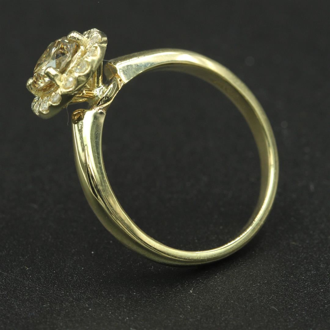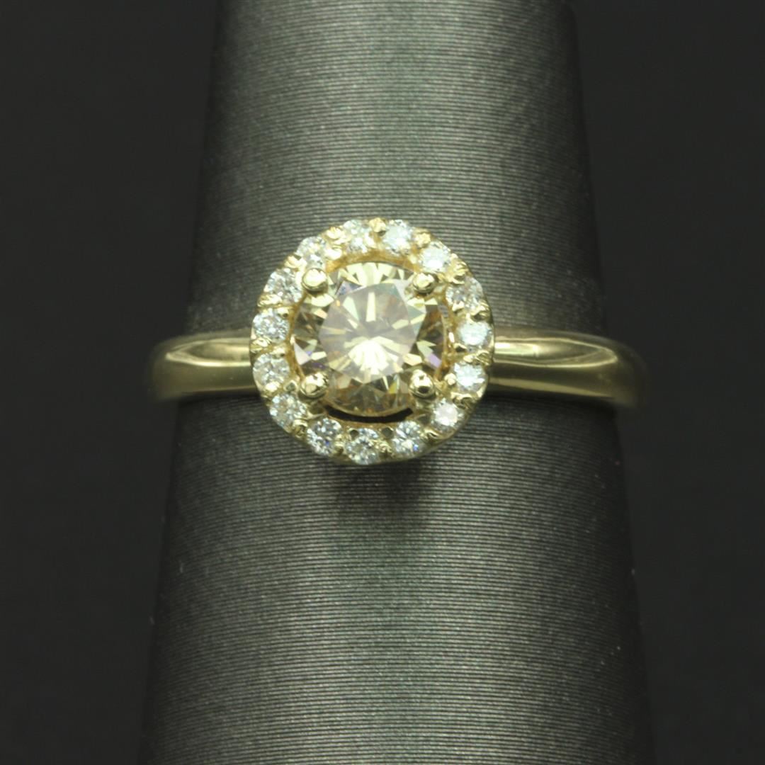 One Natural Brilliant Round Cut Diamond Solitaire Engagement Wedding Ring in 14K Yellow Gold. Setting style of ring is solitaire and traditional. Total carat weight is 0.90 carats with a gross weight of 3.30 grams. Total number of stones is 16. Size is 6.75 but can be resizable free of charge. Condition is brand new. Main stone is non-enhanced and natural. Main diamond is 0.75 carats. Main diamond shape is brilliant round cut, clarity SI1, color is fancy brown, cut is excellent. Side stone is non-enhanced and natural. Side diamond total carat is 0.15 carats, shape brilliant round cut, clarity SI1, color G, and side diamond cut is excellent.