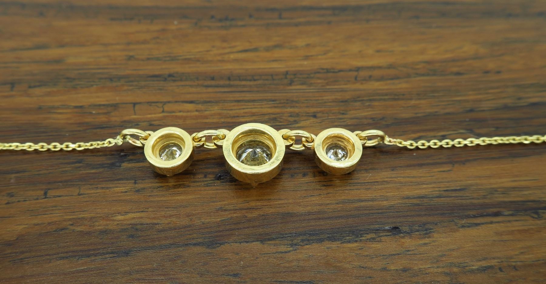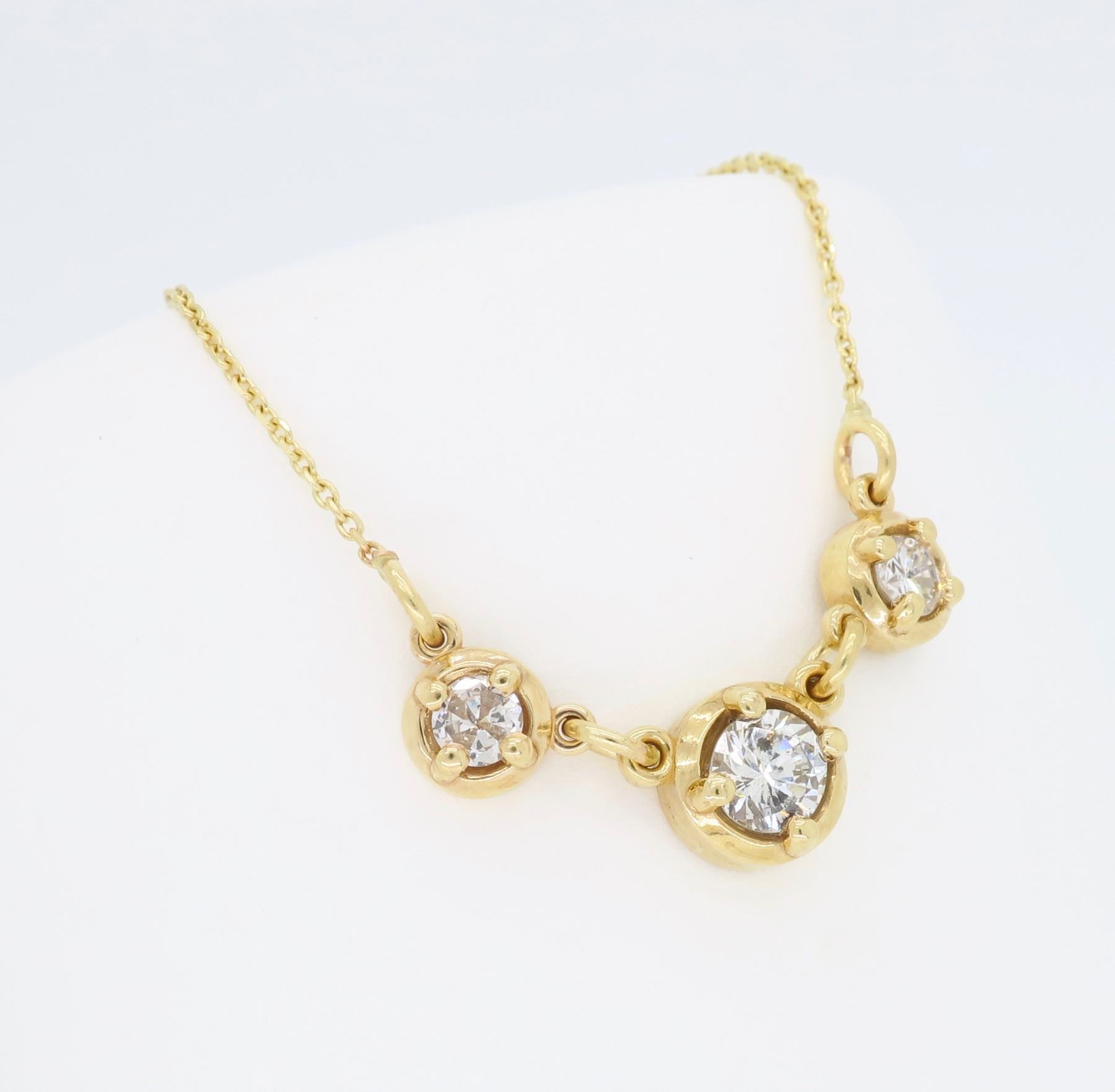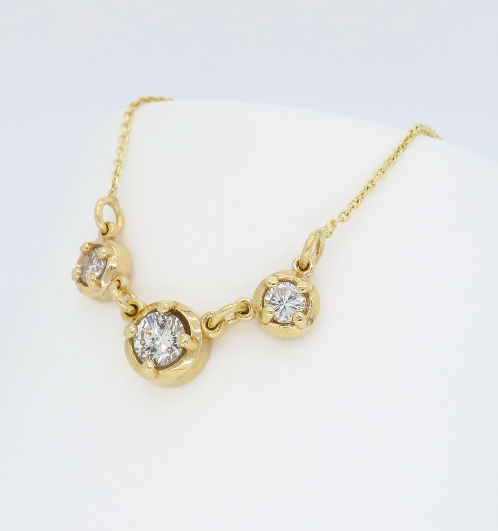 (3) round Diamonds with a total weight of 0.90cts with a color of G-J and clarity of SI-2 to -I-1. Total weight of this pendant is 4.3 grams. Total length of this chain is 19 inches.
