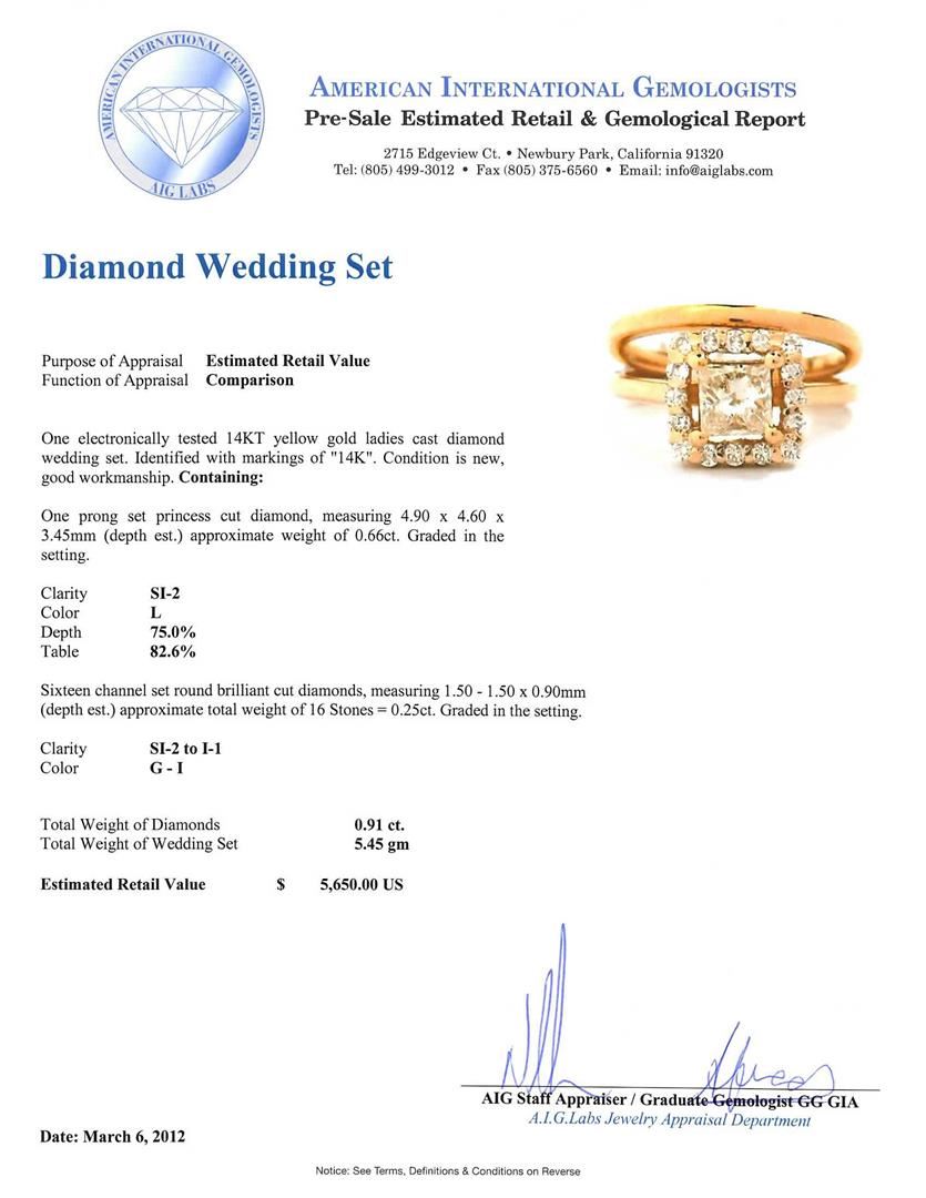 One electronically tested 14KT yellow gold ladies cast diamond wedding set. Identified with markings of "14K". Condition is new, good workmanship. Containing: One prong set princess cut diamond, measuring 4.90 x 4.60 x 3.45mm (depth est.) approximate weight of 0.66ct. Graded in the setting. Clarity SI-2 Color L Depth 75.0% Table 82.6% Sixteen channel set round brilliant cut diamonds, measuring 1.50 x 0.90mm (depth est.) approximate total weight of 16 Stones = 0.25ct. Graded in the setting. Clarity SI-2 to I-1 Color: G-I Total Weight of Diamonds: 0.91 ct. Total Weight of Wedding Set: 5.45 grams. AIG Appraised at $5,650.00.
