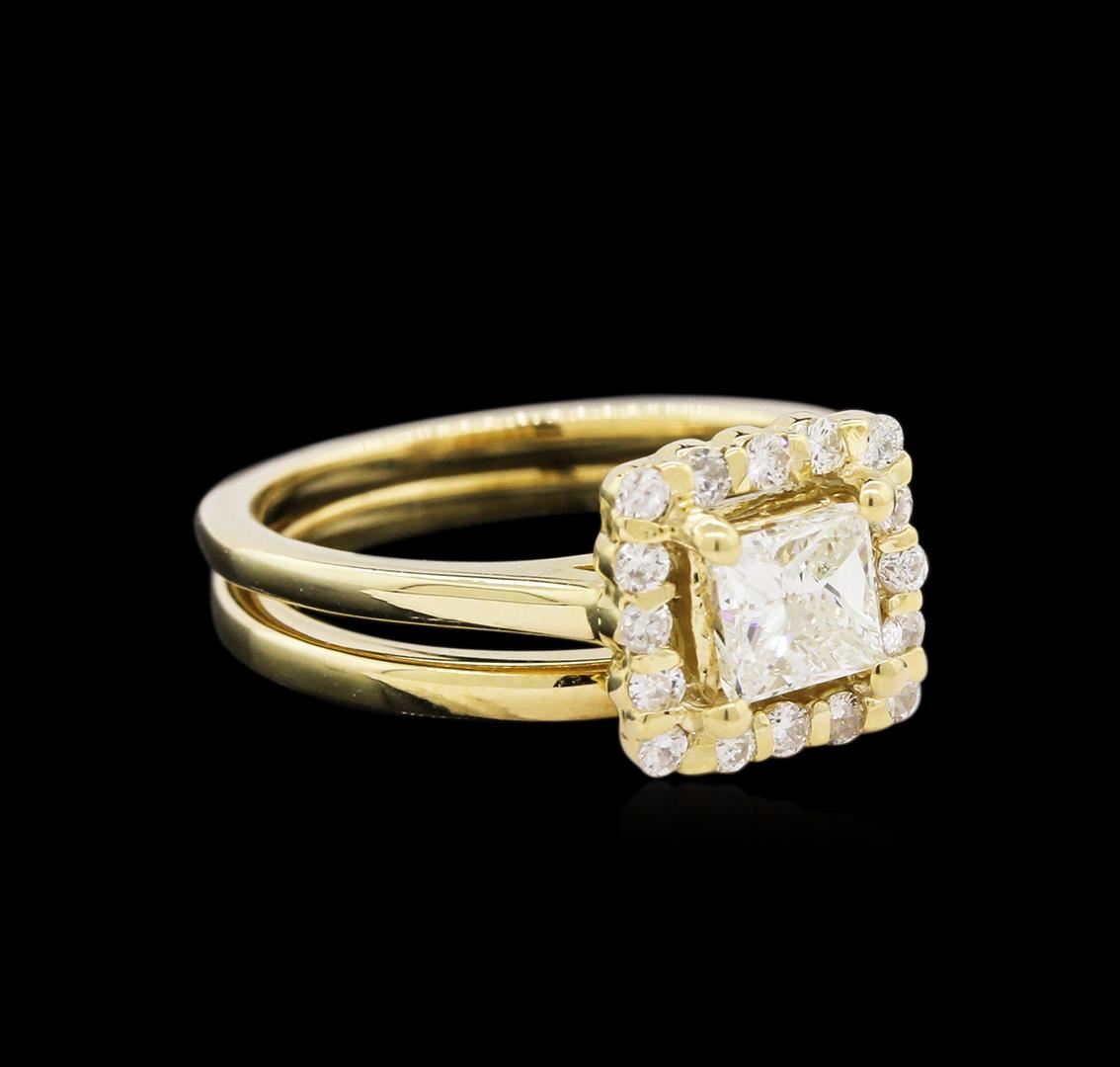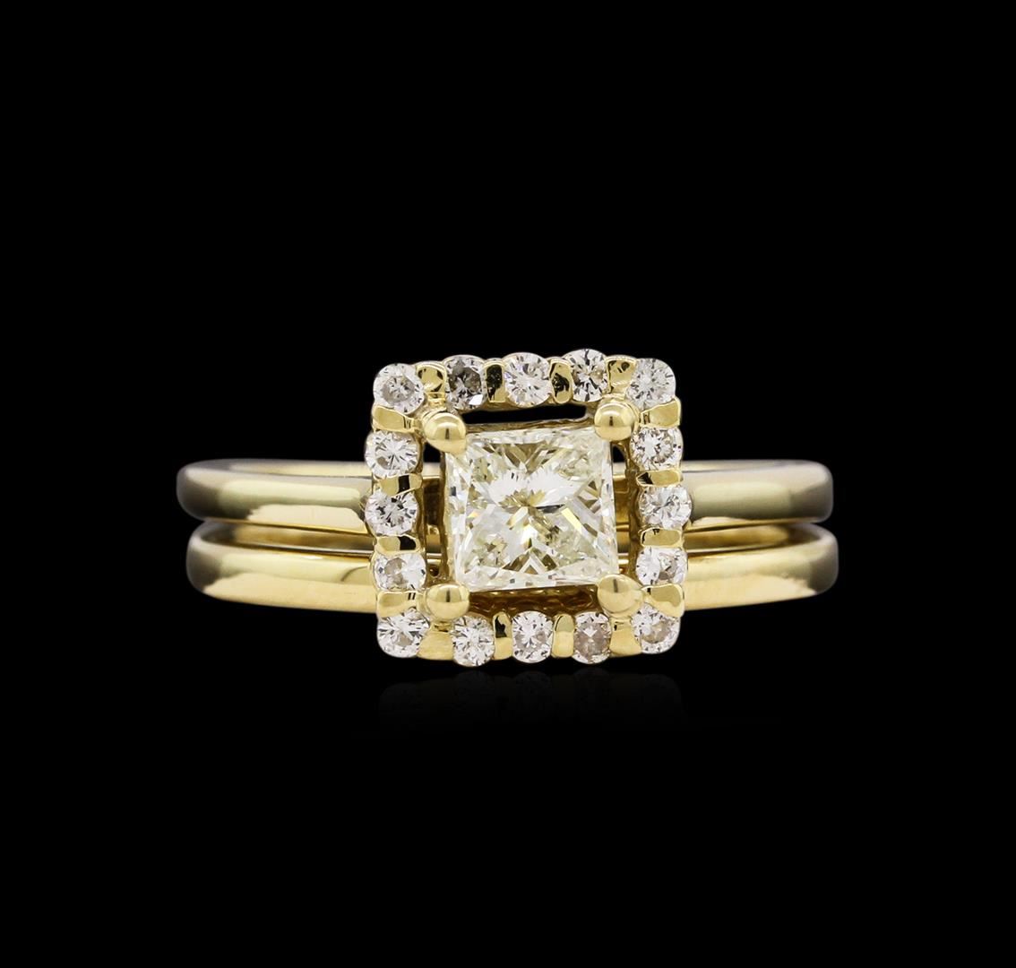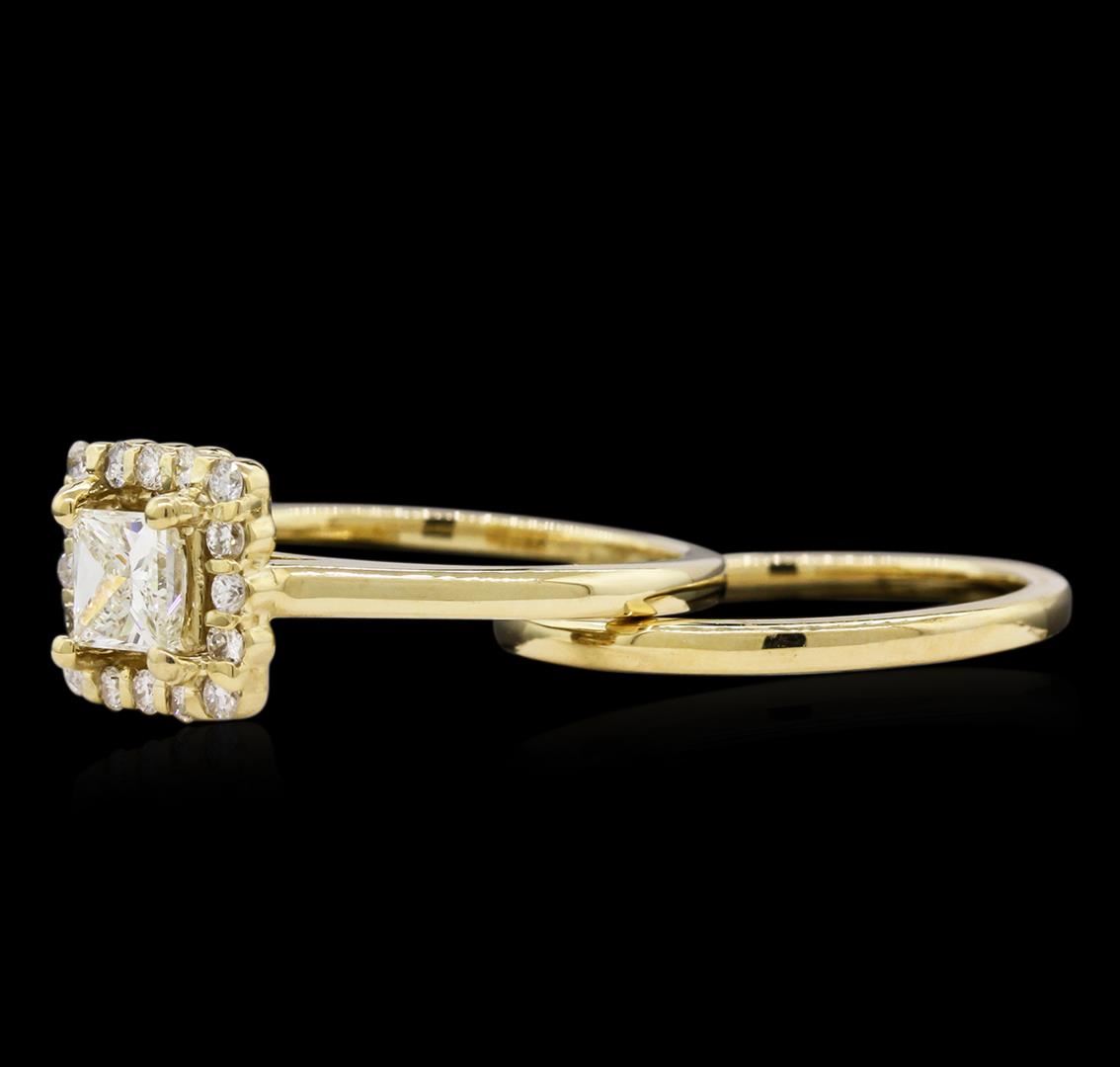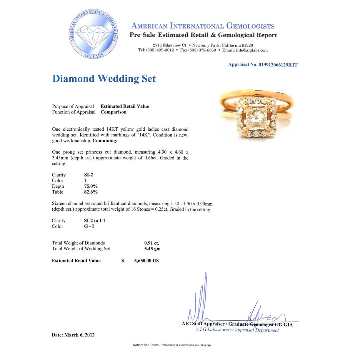 One electronically tested 14KT yellow gold ladies cast diamond wedding set. Identified with markings of "14K". Condition is new, good workmanship. Containing: One prong set princess cut diamond, measuring 4.90 x 4.60 x 3.45mm (depth est.) approximate weight of 0.66ct. Graded in the setting. Clarity SI-2 Color L Depth 75.0% Table 82.6% Sixteen channel set round brilliant cut diamonds, measuring 1.50 x 0.90mm (depth est.) approximate total weight of 16 Stones = 0.25ct. Graded in the setting. Clarity SI-2 to I-1 Color: G-I Total Weight of Diamonds: 0.91 ct. Total Weight of Wedding Set: 5.45 grams. AIG Appraised at $5,650.00.