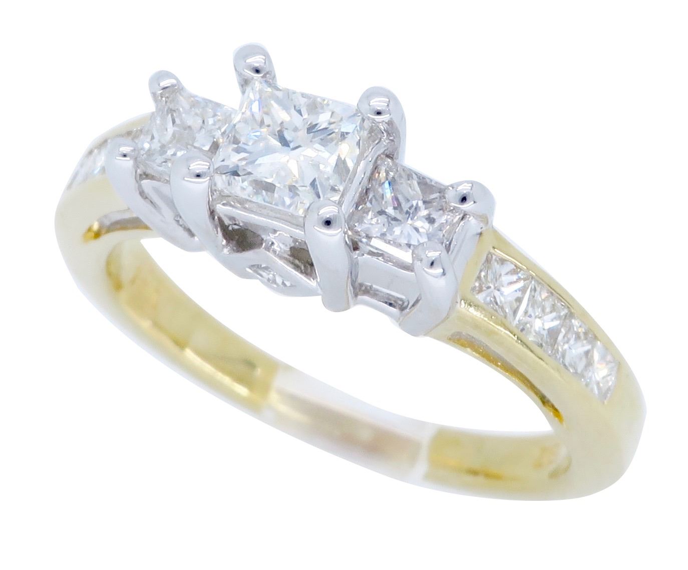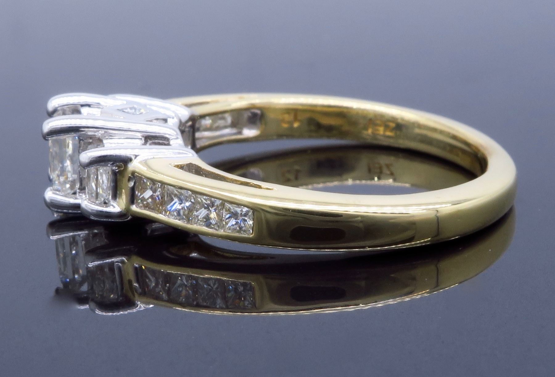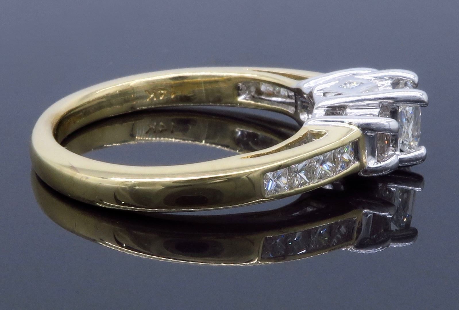 One 14KT Yellow Gold 0.91ctw Diamond Ring. (1) Princess cut Diamond with a total weight of 0.31cts with a color of F-G and clarity of I-1. Side Diamonds with a total weight 0.60cts. Total weight of this ring is 4.2 grams.