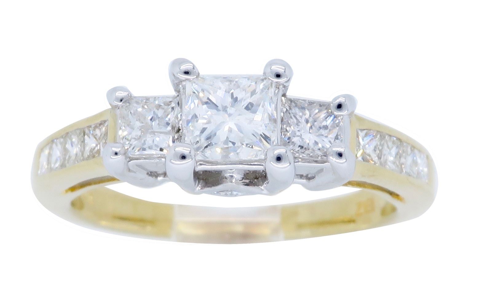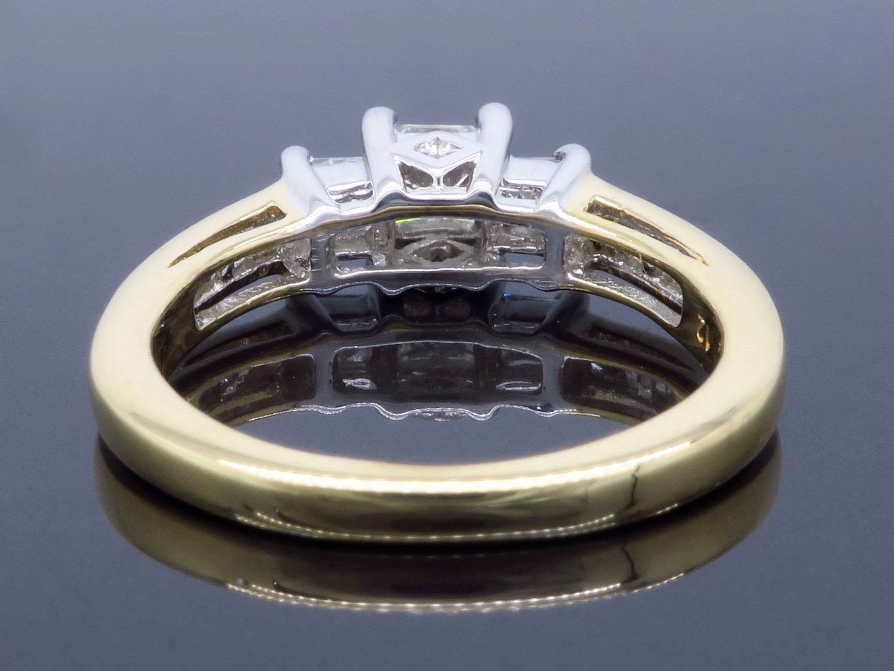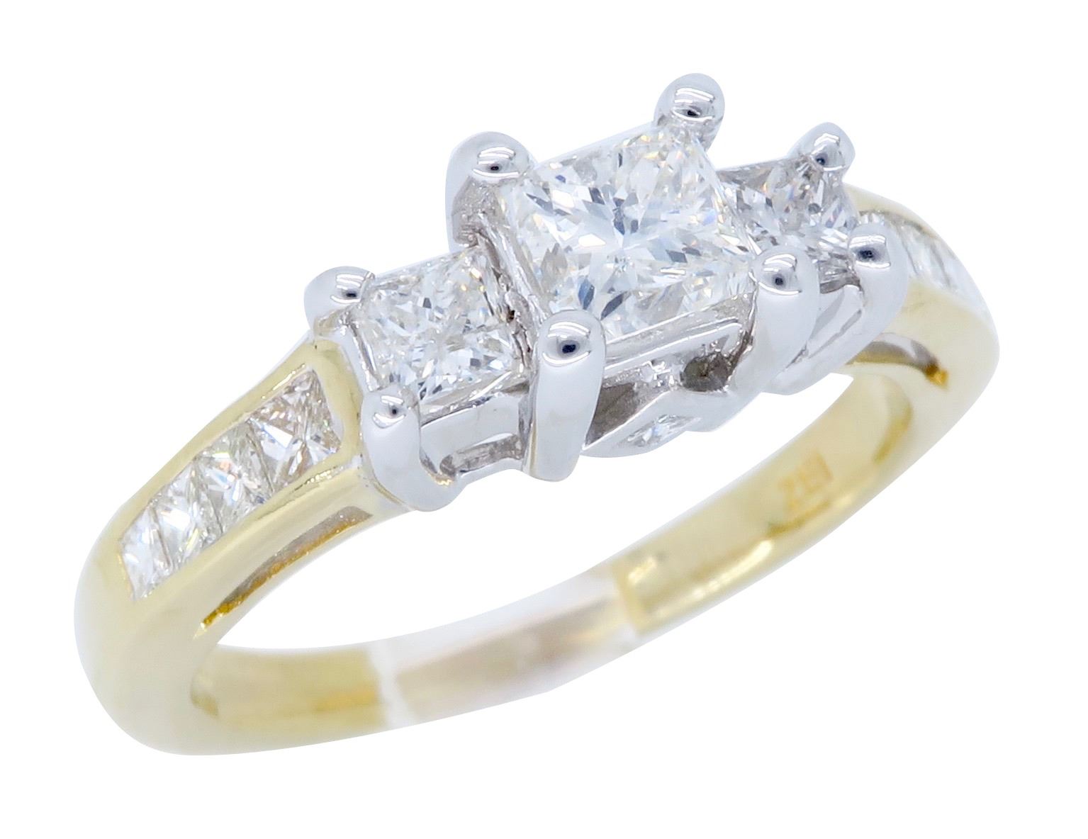 One 14KT Yellow Gold 0.91ctw Diamond Ring. (1) Princess cut Diamond with a total weight of 0.31cts with a color of F-G and clarity of I-1. Side Diamonds with a total weight 0.60cts. Total weight of this ring is 4.2 grams.