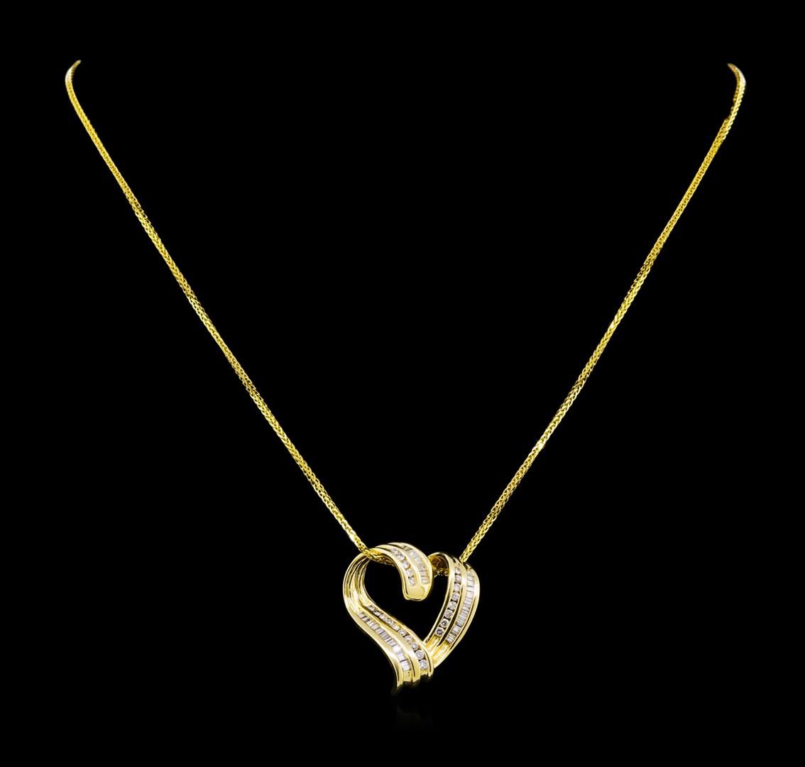 One electronically tested 14KT yellow gold ladies cast and assembled diamond pendant with chain. Condition is new, good workmanship. The pendant features a diamond set heart. The pendant is supported by an eighteen inch length 14KT yellow gold designer style chain, terminating in a lobster claw clasp. Bright polish finish. Identified with markings of "K14". Containing: Twenty-three channel set round brilliant cut diamonds, measuring 1.60 - 1.50 x 0.93mm (depth est) approximate total weight of 23 Stones = 0.41ct. Graded in the setting. Clarity SI-2 to I-1 Color G-I. Thirty-six channel set baguette cut diamonds, measuring from 1.70 x 0.90 x 0.63mm (depth est) to 1.80 x 1.20 x 0.84mm (depth est) 0.90% GTCF approximate total weight of 36 Stones = 0.51ct. Graded in the setting. Clarity VS-1 to SI-1 Color G-I. Total weight of diamonds 0.92ct. Total weight of pendant with chain 9.60 grams. AIG Appraised at $4,920.00.