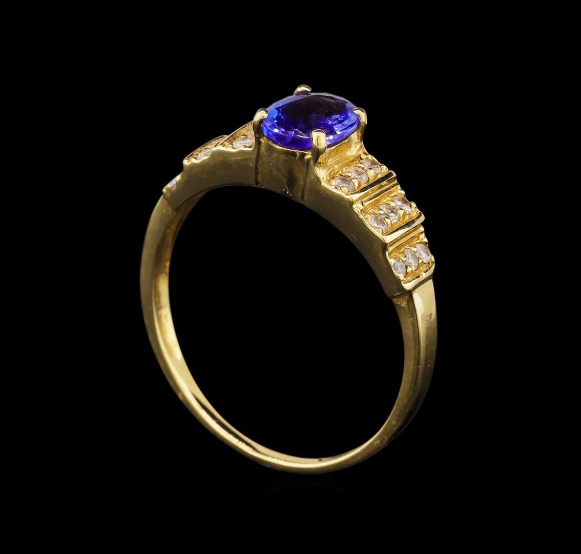 One electronically tested 14KT yellow gold ladies cast tanzanite and diamond ring with a bright polish finish. Identified with markings of "14K". Condition is new. Containing: One prong set oval modified brilliant cut natural tanzanite, measuring 7.30 x 5.30 x 3.45mm, approximate weight of 0.94ct., clarity is eye clean, type I, medium light, slightly grayish, violet color, (GIA V 4/2), cut is good. Eighteen prong set round brilliant cut diamonds, measuring 1.30 - 1.30 x 0.78mm (depth est.) approximate total weight of 18 Stones = 0.14ct. Clarity: I-1 to I-2. Color: I - J. Colored gemstones are presumed to have been subjected to commonly used enhancement processes. All diamonds and colored gemstones are graded in the mounting, unless otherwise stated. Total Weight of Colored Stones 0.94ct. Total Weight of Diamonds 0.14ct. Total Weight of Ring 3.10 grams. GGL Appraised at $1,665.00.