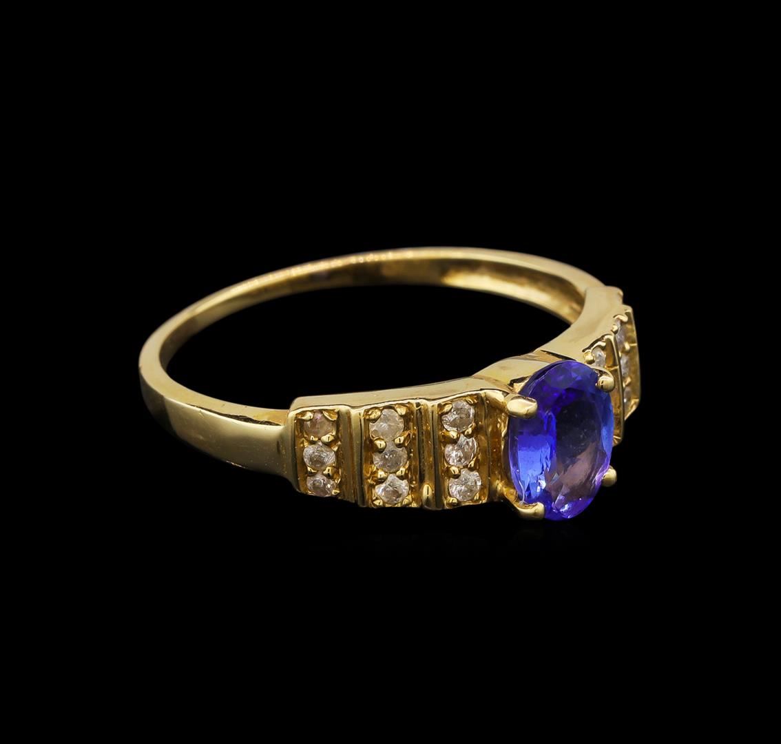 One electronically tested 14KT yellow gold ladies cast tanzanite and diamond ring with a bright polish finish. Identified with markings of "14K". Condition is new. Containing: One prong set oval modified brilliant cut natural tanzanite, measuring 7.30 x 5.30 x 3.45mm, approximate weight of 0.94ct., clarity is eye clean, type I, medium light, slightly grayish, violet color, (GIA V 4/2), cut is good. Eighteen prong set round brilliant cut diamonds, measuring 1.30 - 1.30 x 0.78mm (depth est.) approximate total weight of 18 Stones = 0.14ct. Clarity: I-1 to I-2. Color: I - J. Colored gemstones are presumed to have been subjected to commonly used enhancement processes. All diamonds and colored gemstones are graded in the mounting, unless otherwise stated. Total Weight of Colored Stones 0.94ct. Total Weight of Diamonds 0.14ct. Total Weight of Ring 3.10 grams. GGL Appraised.