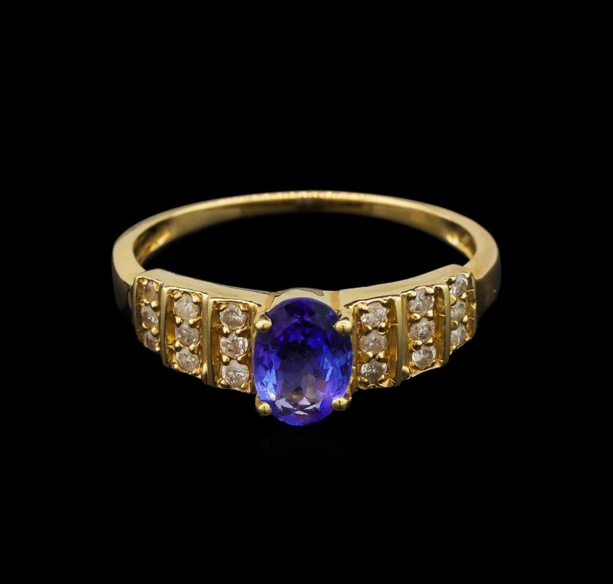 One electronically tested 14KT yellow gold ladies cast tanzanite and diamond ring with a bright polish finish. Identified with markings of "14K". Condition is new. Containing: One prong set oval modified brilliant cut natural tanzanite, measuring 7.30 x 5.30 x 3.45mm, approximate weight of 0.94ct., clarity is eye clean, type I, medium light, slightly grayish, violet color, (GIA V 4/2), cut is good. Eighteen prong set round brilliant cut diamonds, measuring 1.30 - 1.30 x 0.78mm (depth est.) approximate total weight of 18 Stones = 0.14ct. Clarity: I-1 to I-2. Color: I - J. Colored gemstones are presumed to have been subjected to commonly used enhancement processes. All diamonds and colored gemstones are graded in the mounting, unless otherwise stated. Total Weight of Colored Stones 0.94ct. Total Weight of Diamonds 0.14ct. Total Weight of Ring 3.10 grams. GGL Appraised.
