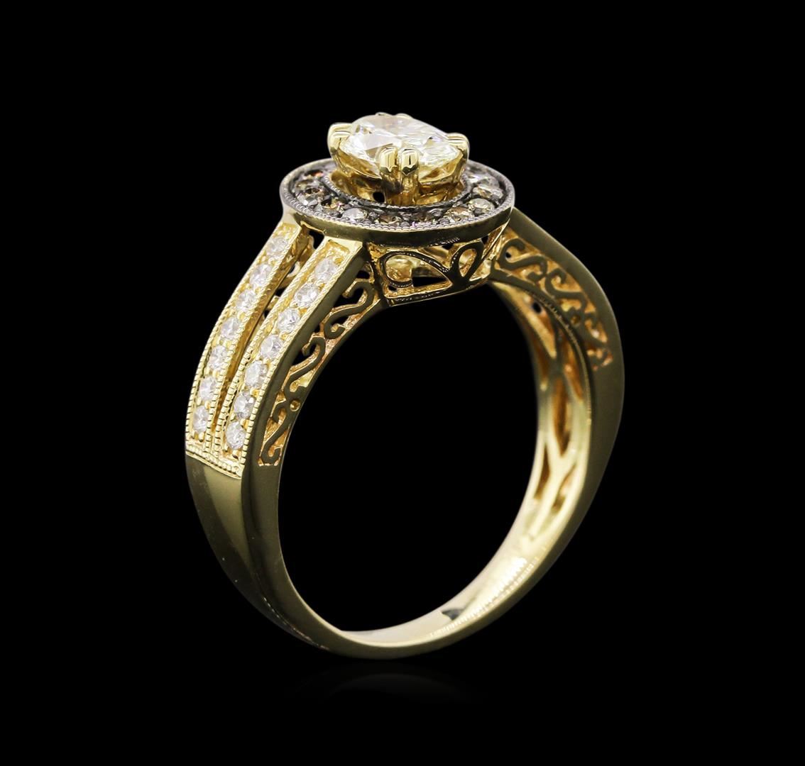 One electronically tested 14KT yellow gold ladies cast & assembled diamond unity ring. Condition is new, good workmanship. The ring features an oval diamond set within a ribbon of diamonds supported by two diamond supported by two diamond set shoulders tapering into a single two and a half millimeter wide band. Bright polish with black rhodium and migraine accents. Trademark is PMI. Identified with markings of "14K". Containing: One prong set oval shaped cut diamond, measuring 6.20 x 4.50 x 2.84mm (depth est.) approximate weight of 0.50ct. Graded in the setting. Clarity: VS-2. Color: Very Light Yellow. Twenty-eight prong set round brilliant cut diamonds, measuring 1.40 -- 1.30 x 0.81mm (depth est.) approximate total weight of 28 Stones = 0.25ct. Graded in the setting. Clarity: I-1 to I-2. Color: G-I. Sixteen prong set round brilliant cut diamonds, measuring 1.50 -- 1.50 x 0.90mm (depth est.) approximate total weight of 16 Stones = 0.20ct. Graded in the setting. Clarity: SI-1 to SI-2. Color: Faint Brown. Total Weight of Diamonds: 0.95ct. Total Weight of Ring: 3.67gm. AIG Appraised at $3,500.00.