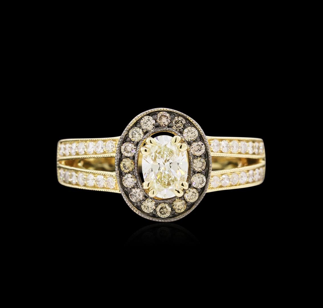 One electronically tested 14KT yellow gold ladies cast & assembled diamond unity ring. Condition is new, good workmanship. The ring features an oval diamond set within a ribbon of diamonds supported by two diamond supported by two diamond set shoulders tapering into a single two and a half millimeter wide band. Bright polish with black rhodium and migraine accents. Trademark is PMI. Identified with markings of "14K". Containing: One prong set oval shaped cut diamond, measuring 6.20 x 4.50 x 2.84mm (depth est.) approximate weight of 0.50ct. Graded in the setting. Clarity: VS-2. Color: Very Light Yellow. Twenty-eight prong set round brilliant cut diamonds, measuring 1.40 -- 1.30 x 0.81mm (depth est.) approximate total weight of 28 Stones = 0.25ct. Graded in the setting. Clarity: I-1 to I-2. Color: G-I. Sixteen prong set round brilliant cut diamonds, measuring 1.50 -- 1.50 x 0.90mm (depth est.) approximate total weight of 16 Stones = 0.20ct. Graded in the setting. Clarity: SI-1 to SI-2. Color: Faint Brown. Total Weight of Diamonds: 0.95ct. Total Weight of Ring: 3.67gm. AIG Appraised at $3,500.00.