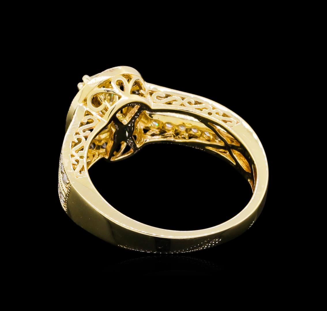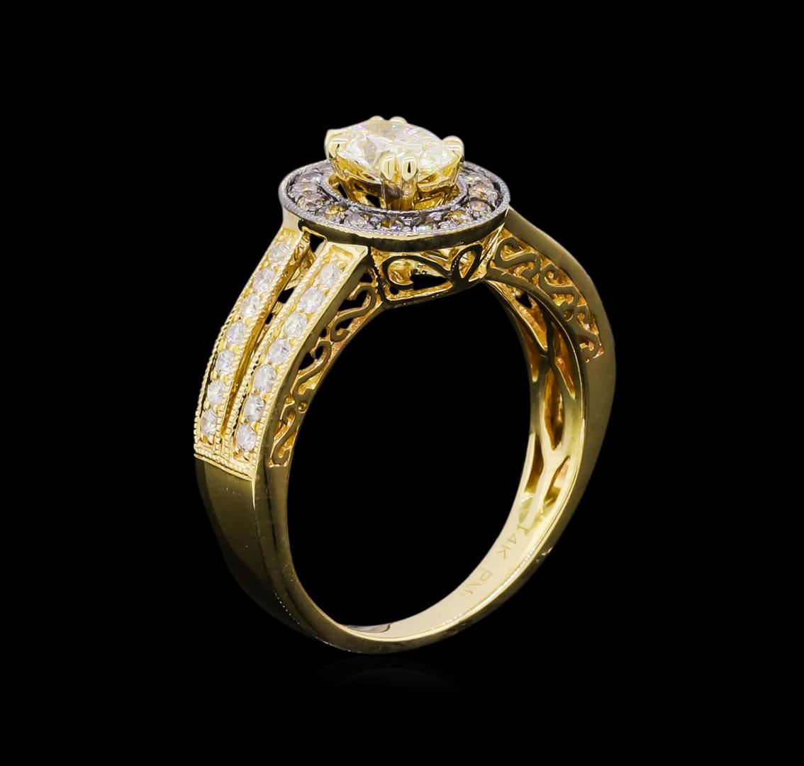 One electronically tested 14KT yellow gold ladies cast & assembled diamond unity ring. Condition is new, good workmanship. The ring features an oval diamond set within a ribbon of diamonds supported by two diamond supported by two diamond set shoulders tapering into a single two and a half millimeter wide band. Bright polish with black rhodium and migraine accents. Trademark is PMI. Identified with markings of "14K". Containing: One prong set oval shaped cut diamond, measuring 6.20 x 4.50 x 2.84mm (depth est.) approximate weight of 0.50ct. Graded in the setting. Clarity: VS-2. Color: Very Light Yellow. Twenty-eight prong set round brilliant cut diamonds, measuring 1.40 -- 1.30 x 0.81mm (depth est.) approximate total weight of 28 Stones = 0.25ct. Graded in the setting. Clarity: I-1 to I-2. Color: G-I. Sixteen prong set round brilliant cut diamonds, measuring 1.50 -- 1.50 x 0.90mm (depth est.) approximate total weight of 16 Stones = 0.20ct. Graded in the setting. Clarity: SI-1 to SI-2. Color: Faint Brown. Total Weight of Diamonds: 0.95ct. Total Weight of Ring: 3.67gm. AIG Appraised.