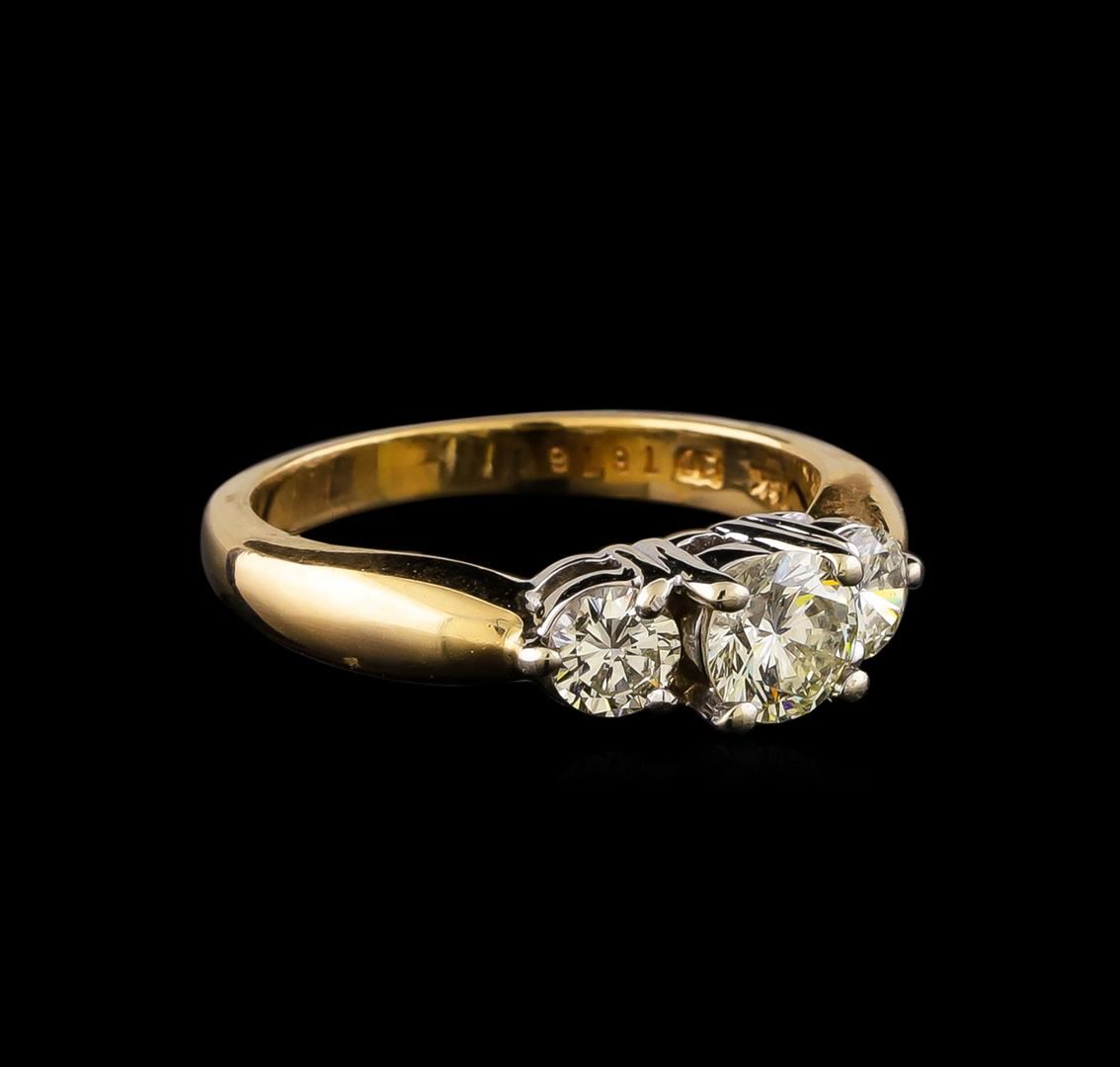 One electronically tested 14KT yellow gold ladies combination cast & assembled engagement ring with a bright polish finish. Identified with markings of "14K". Condition is very good. Containing: One prong set round brilliant cut diamond, measuring 5.16 - 5.13 x 3.09mm (depth est.) approximate weight of 0.50ct. Clarity: SI-2. Color: K, Cut is Good. Two prong set round brilliant cut diamonds, measuring 3.86 - 3.86 x 2.01mm (depth est.) approximate total weight of 2 Stones = 0.47ct. Clarity: SI-1 to SI-2. Color: J, Cut is Good. All diamonds are graded in the mounting, unless otherwise stated. Total Weight of Diamonds 0.97ct. Total Weight of Ring 4.20 grams. GGL Appraised at $5,535.00.