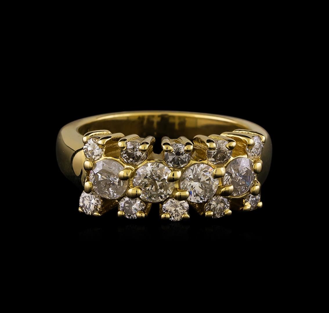 One electronically tested 14KT yellow gold ladies combination cast & assembled diamond ring with a bright polish finish. Identified with markings of "14K". Condition is new. Containing: Four prong set round brilliant cut diamonds, measuring 3.50 - 3.50 x 2.10mm (depth est.) approximate total weight of 4 Stones = 0.63ct. Clarity: I-2. Color: K, Cut is Good. Ten prong set round brilliant cut diamonds, measuring 2.10 - 2.10 x 1.26mm (depth est.) approximate total weight of 10 Stones = 0.34ct. Clarity: I-1 to I-2. Color: K - L, Cut is Good. All diamonds are graded in the mounting, unless otherwise stated. Total Weight of Diamonds 0.97ct. Total Weight of Ring 6.50 grams. GGL Appraised at $4,415.00.